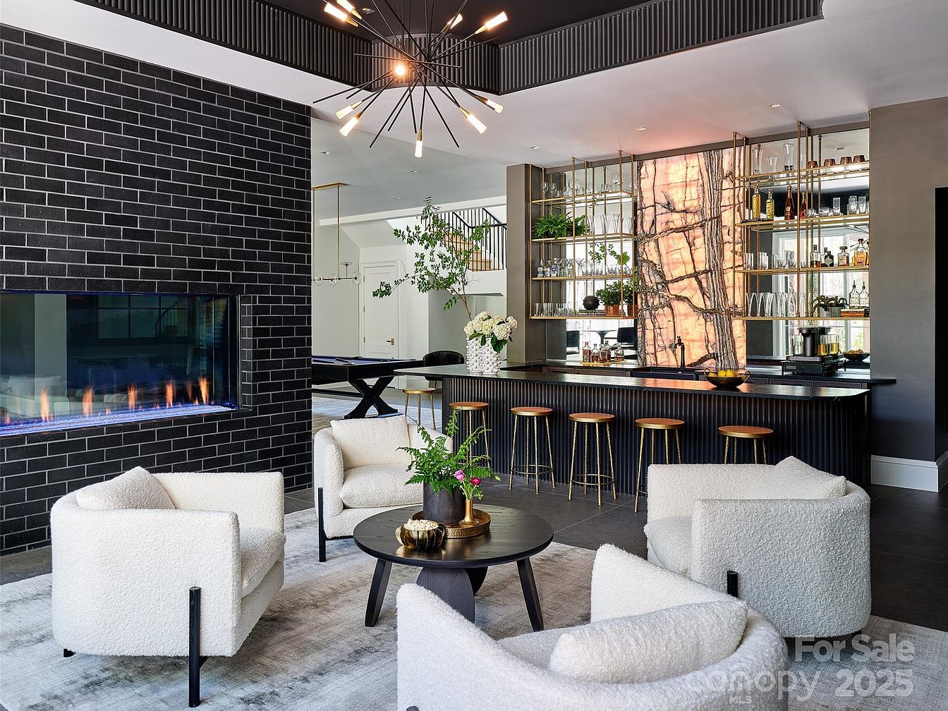 A sophisticated lounge seamlessly blends contemporary comfort with upscale style, featuring plush white boucle armchairs arranged around a sleek black coffee table for casual gatherings or family conversations. The focal point is a dramatic black brick fireplace, adding warmth with its elongated flames, while a dazzling statement chandelier above enhances the modern atmosphere. The open-concept layout flows into a striking wet bar, which boasts a stunning illuminated stone backsplash, elegant glass shelving, and brass accents. Family-friendly features include spacious seating, an inviting environment for entertaining, and easy visibility across the room, making it ideal for relaxing or hosting guests.