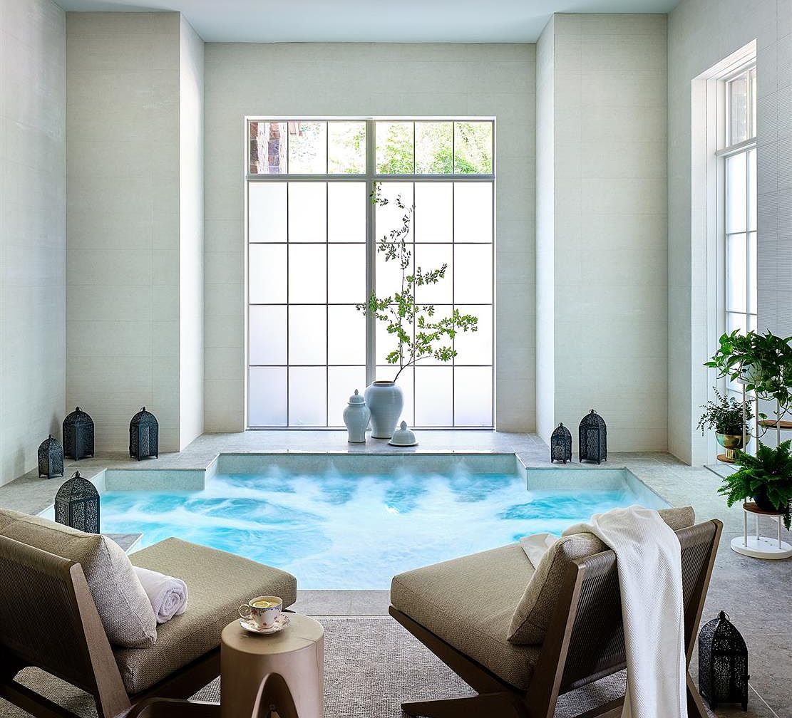 A serene indoor pool area blends modern elegance with family-friendly comfort. The layout centers around a compact, rectangular pool surrounded by soft-toned tile flooring and pale, neutral walls that invite natural light from expansive grid windows. Comfortable lounge chairs with plush cushions provide a cozy spot to relax, complemented by a small round side table ideal for drinks or snacks. Black lanterns and decorative ceramic vases add subtle sophistication, while vibrant potted plants bring an element of nature indoors. This tranquil sanctuary encourages relaxation and togetherness, making it a perfect family space for unwinding and quiet conversation.