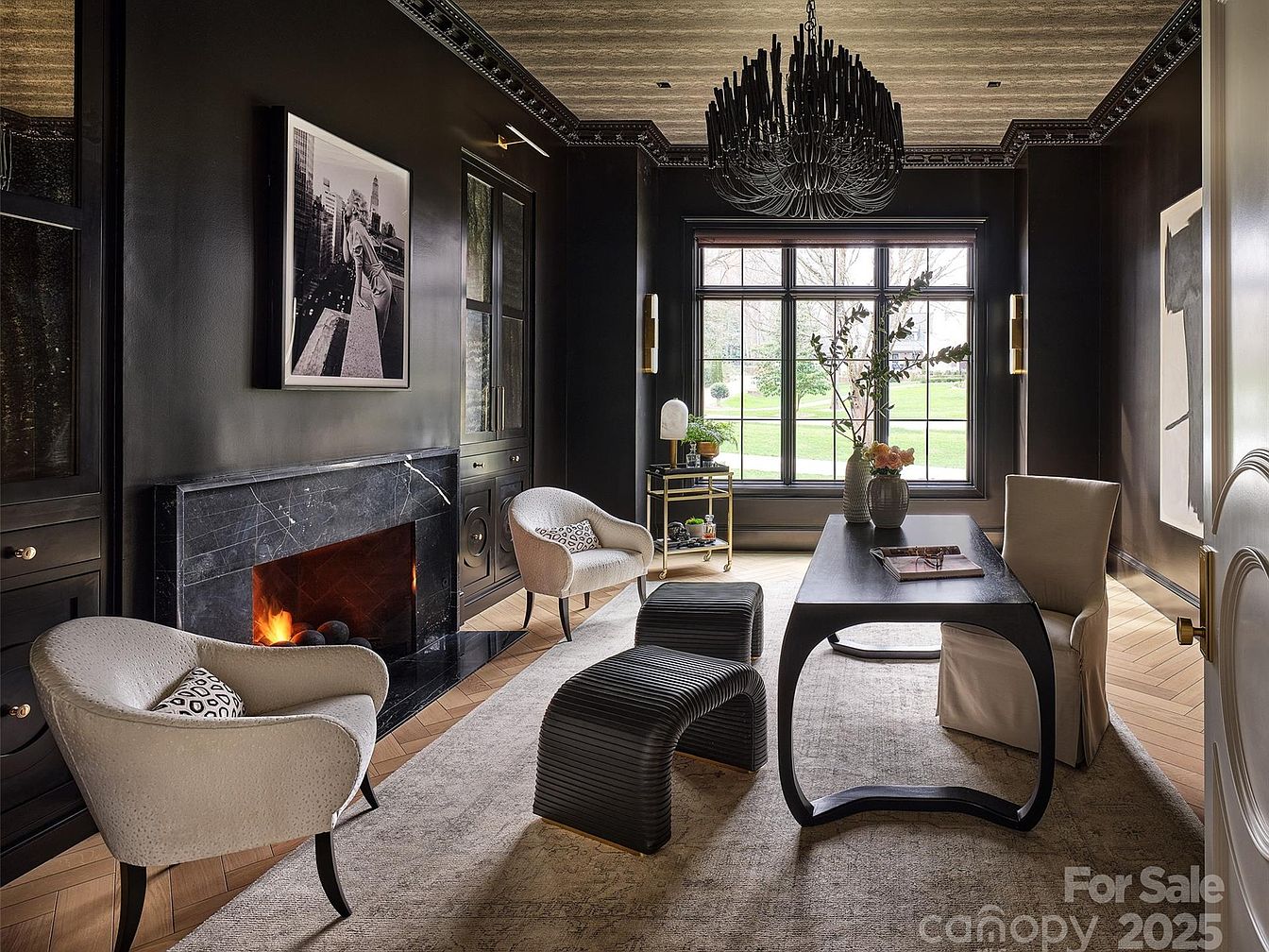 This home office combines modern elegance with family-friendly comfort, featuring a dramatic black color palette and abundant natural light from large windows overlooking the front yard. The room centers on a striking black marble fireplace and is accented by a sculptural black chandelier. Plush, light-upholstered armchairs provide cozy seating for reading or conversation, while a sleek black desk anchors the workspace. Built-in cabinetry offers ample storage, keeping the area tidy and organized for work or family use. Subtle gold touches and neutral-hued rugs add warmth and sophistication, creating an inspiring environment suitable for productivity or intimate gatherings.