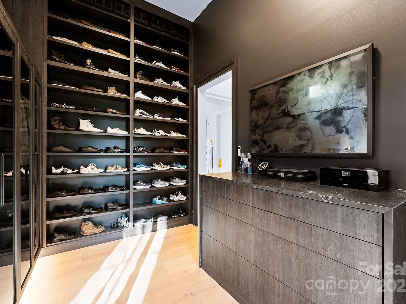 Sleek and impeccably organized, this shoe closet features full-wall custom shelving displaying a large collection of footwear, making it a dream for any family. Matte black built-in drawers offer ample storage for accessories, while a black marble countertop adds sophistication. The room’s charcoal walls set a modern, masculine tone, contrasted by light hardwood flooring that warmly opens up the space. Contemporary artwork above the dresser enhances the upscale ambiance. This closet’s spacious walkways and accessible organization create a family-friendly environment, perfect for busy mornings or fashion-forward households looking for efficient, stylish storage.