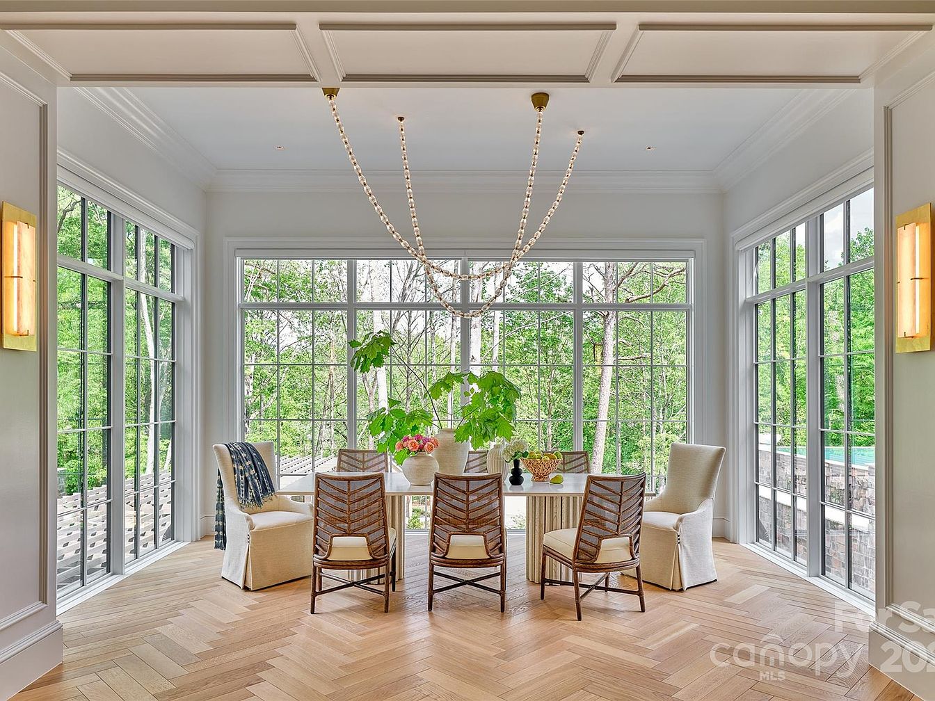 Step into a stunning dining area embraced by floor-to-ceiling windows on three sides, offering panoramic views of lush greenery and abundant natural light. The space features elegant herringbone-patterned wood flooring and crisp white walls that enhance the airy ambiance. A modern chandelier with sculptural lines serves as a focal point above a round dining table, surrounded by a mix of cozy upholstered armchairs and stylish wooden chairs. The calm, neutral color palette is elevated by fresh greenery and floral arrangements, creating a family-friendly setting perfect for gatherings and everyday meals in harmony with nature.