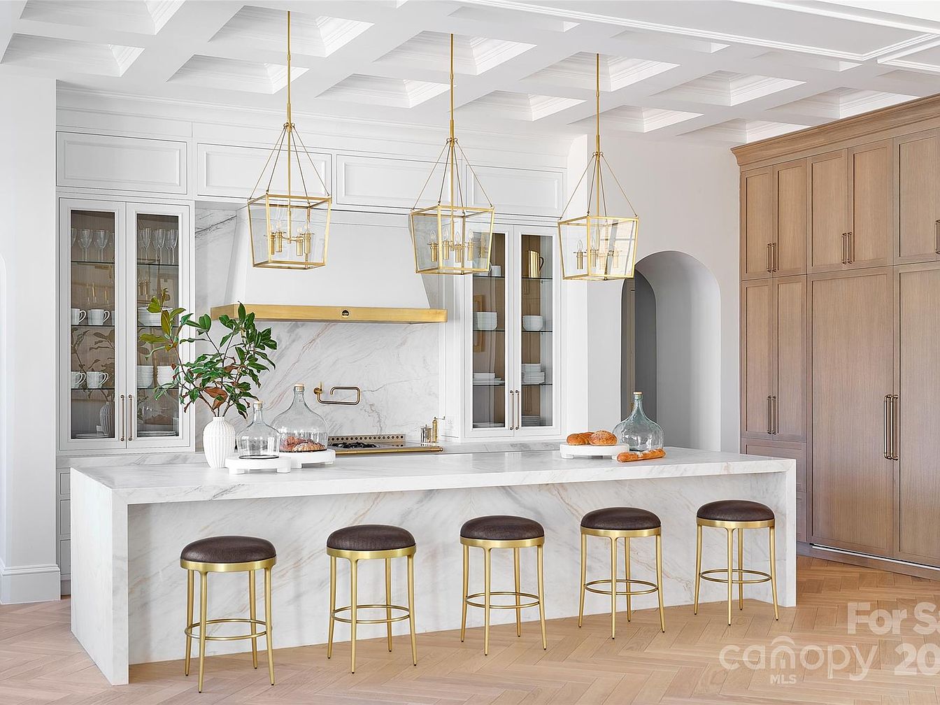 A spacious kitchen embraces modern elegance with a large marble island serving as both a workspace and a gathering spot for the family. Sleek gold-accented stools provide comfortable seating, making it perfect for breakfasts or casual conversations. Three geometric pendant lights with gold detailing illuminate the area, highlighting the coffered ceiling above. Clean, white cabinetry, glass-front display cabinets, and soft wood-paneled refrigerator doors balance the crisp white palette, while the polished brass hardware and range hood add a touch of luxury. Family-friendly, the kitchen’s open layout and durable surfaces invite both daily use and entertaining, blending practicality with timeless sophistication.