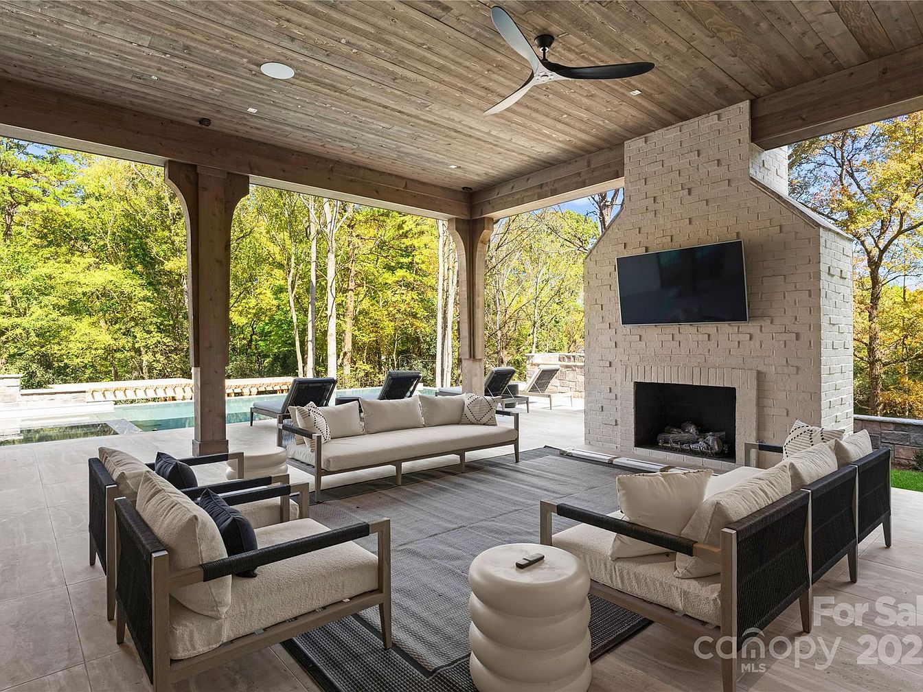 A spacious covered patio lounge blends outdoor living with comfort and style, featuring a modern white brick fireplace topped with a mounted TV for family movie nights or sports gatherings. Neutral-toned cushioned sofas and armchairs are arranged for conversation around a large rug, making the area inviting for relaxation. The wood-paneled ceiling with a sleek fan enhances the cozy atmosphere. Large pillars frame views of the lush backyard and sparkling pool, perfect for children to play nearby. The open layout ensures easy flow between the indoor and outdoor areas, catering to both entertaining and quiet family evenings.