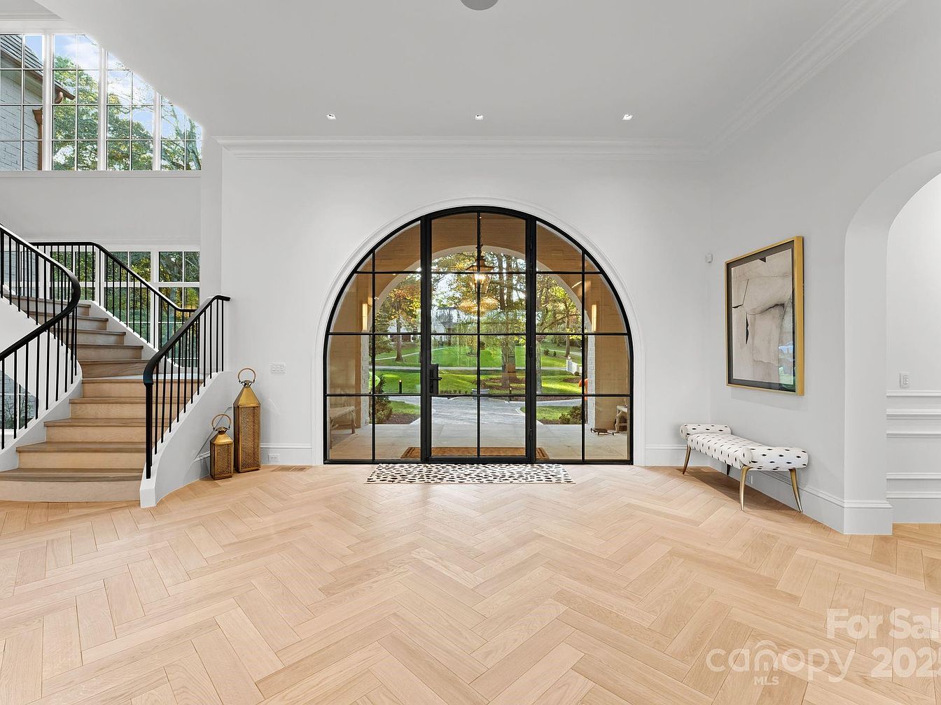 A striking entryway welcomes guests with its grand arched black-framed glass doors, inviting abundant natural light and scenic outdoor views. The spacious foyer features light herringbone wood flooring, creating texture and warmth that complements the crisp white walls and high ceilings. A sweeping staircase with sleek black railings provides architectural interest and easy access to upper floors, while modern gold lantern accents and a plush polka-dot bench add family-friendly charm and functionality. Subtle artwork and thoughtful design make this entryway both stylish and practical, providing a bright, welcoming atmosphere ideal for family living and entertaining alike.
