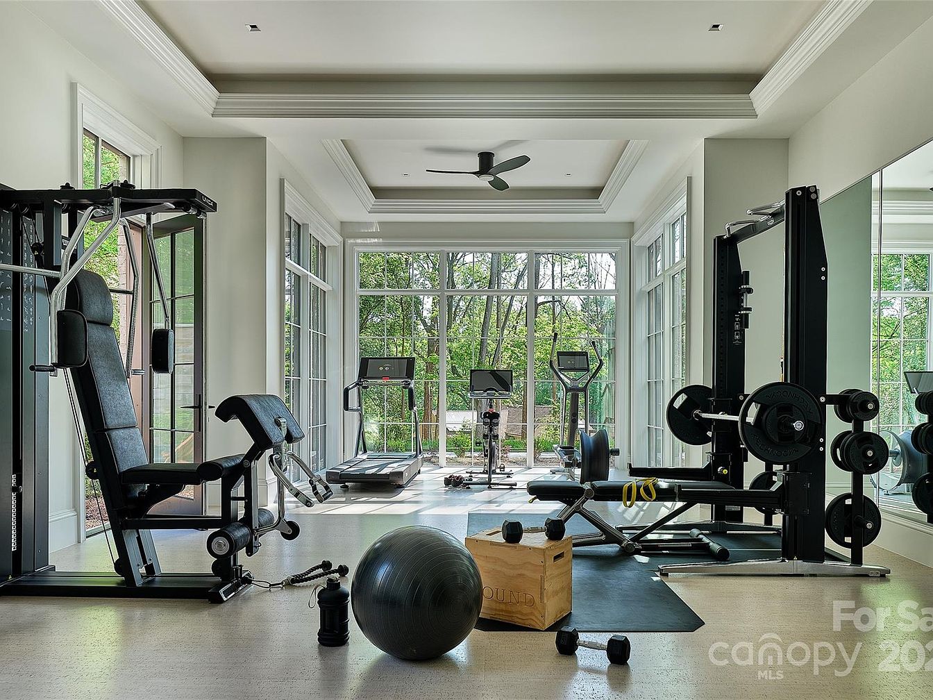 This bright, contemporary home gym features floor-to-ceiling windows on three sides, flooding the space with natural light and scenic views of the surrounding trees. The open layout allows for a variety of fitness equipment, including a multi-functional weight machine, benches, treadmills, and free weights, making it suitable for both adults and teens to enjoy active routines together. A soft neutral color palette, coffered ceiling, and clean-lined architectural details create a calming and motivating environment. Mirrored walls enhance the sense of space and light, while durable flooring ensures safety and easy maintenance for family workouts.