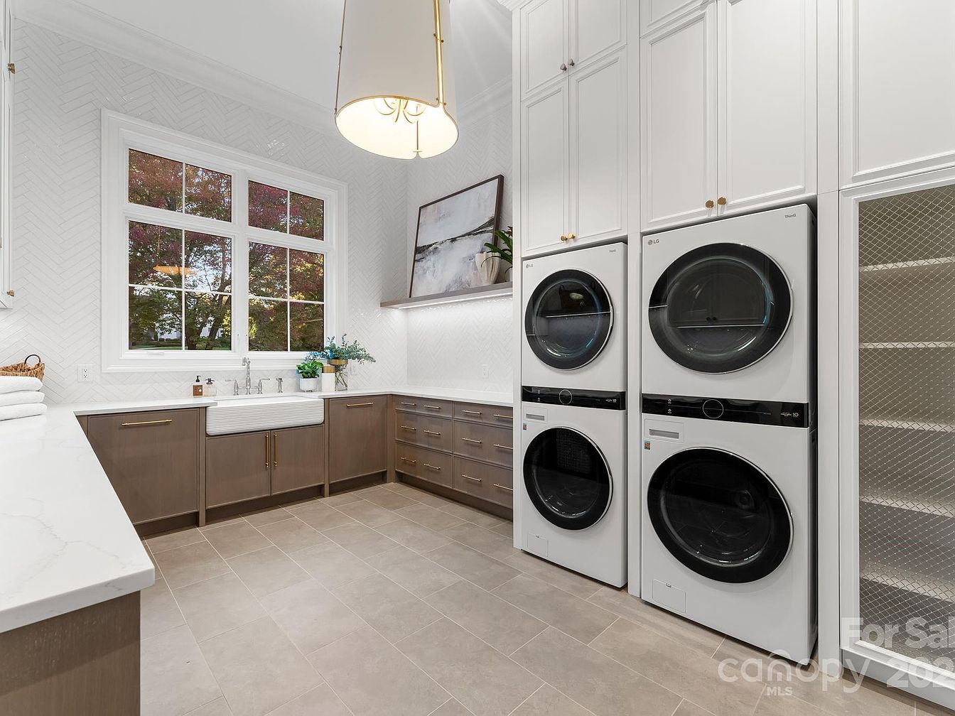 Spacious and bright, this laundry room features double-stacked washers and dryers, perfect for a busy household. The classic farmhouse sink sits beneath a large window, allowing daylight to flood the space, making laundry tasks more enjoyable. Custom cabinetry in soft wood tones provides ample storage and a touch of sophistication, while the white herringbone tile backsplash and quartz countertops create a crisp, clean look. Sleek gold hardware adds a modern touch to the cabinetry, and the open shelving offers convenient access to essentials. This highly functional layout caters to the needs of families, ensuring efficiency and organization.