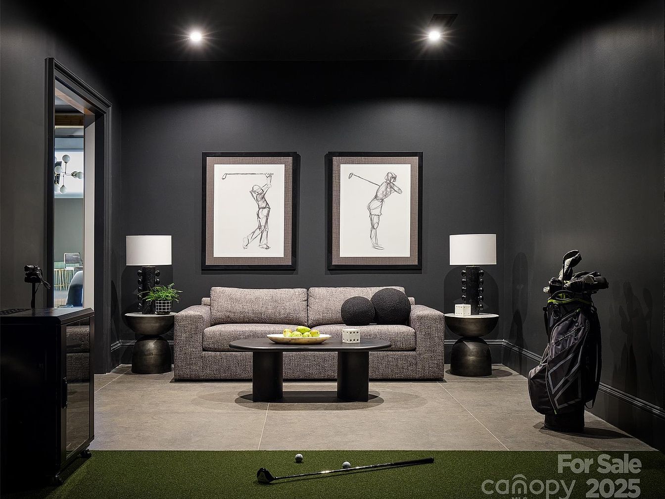 A modern entertainment lounge tailored for golf enthusiasts, this space blends comfort and sport effortlessly. A mid-century gray sofa takes center stage, surrounded by two sculptural black side tables adorned with statement lamps and lush greenery. Twin framed golf-themed sketches provide visual interest and celebrate the room’s purpose. The darker walls and ceiling create a cozy, immersive atmosphere, while recessed lighting focuses attention on the seating area. Durable stone-look flooring meets a putting green mat, inviting family fun and relaxation. The golf bag and casual decor foster a welcoming, multi-use retreat ideal for sports practice, family gatherings, or entertaining friends.