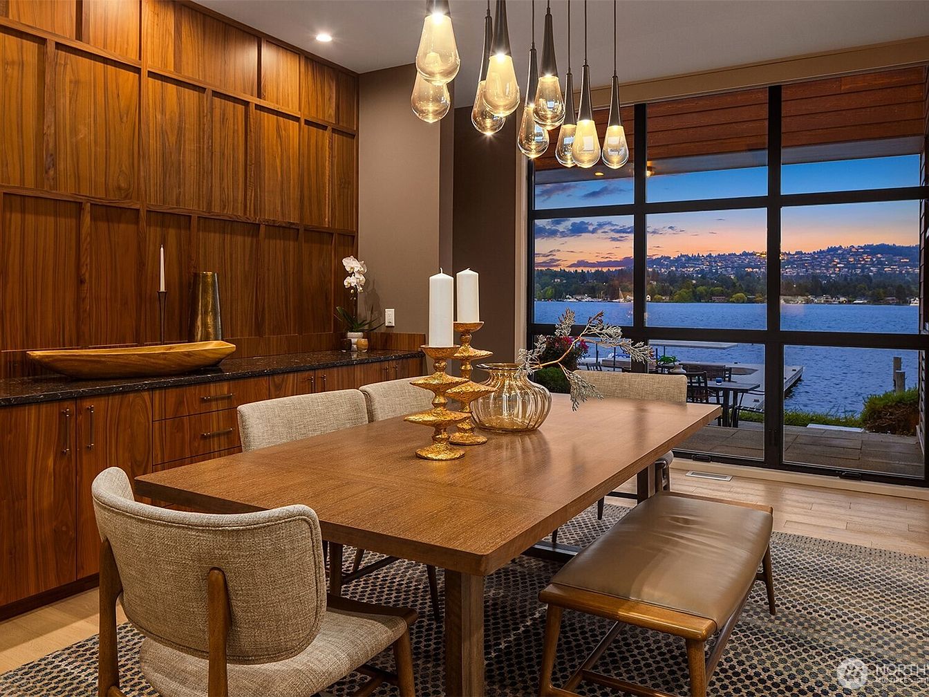 Warm wood paneling accentuates the modern dining room, complemented by plush upholstered chairs and a spacious wooden table perfect for family dinners or entertaining guests. The setting is illuminated by elegant pendant lights creating a cozy ambiance, while a set of gold candle holders and a decorative vase serve as stylish centerpieces. Sliding glass doors open up to a stunning lakeside panorama, seamlessly blending indoor and outdoor living. Family-friendly features include ample seating with a comfortable bench, easy-to-clean textured rug, and convenient built-in cabinetry for additional storage. The neutral tones and clean lines exude sophisticated, inviting charm.