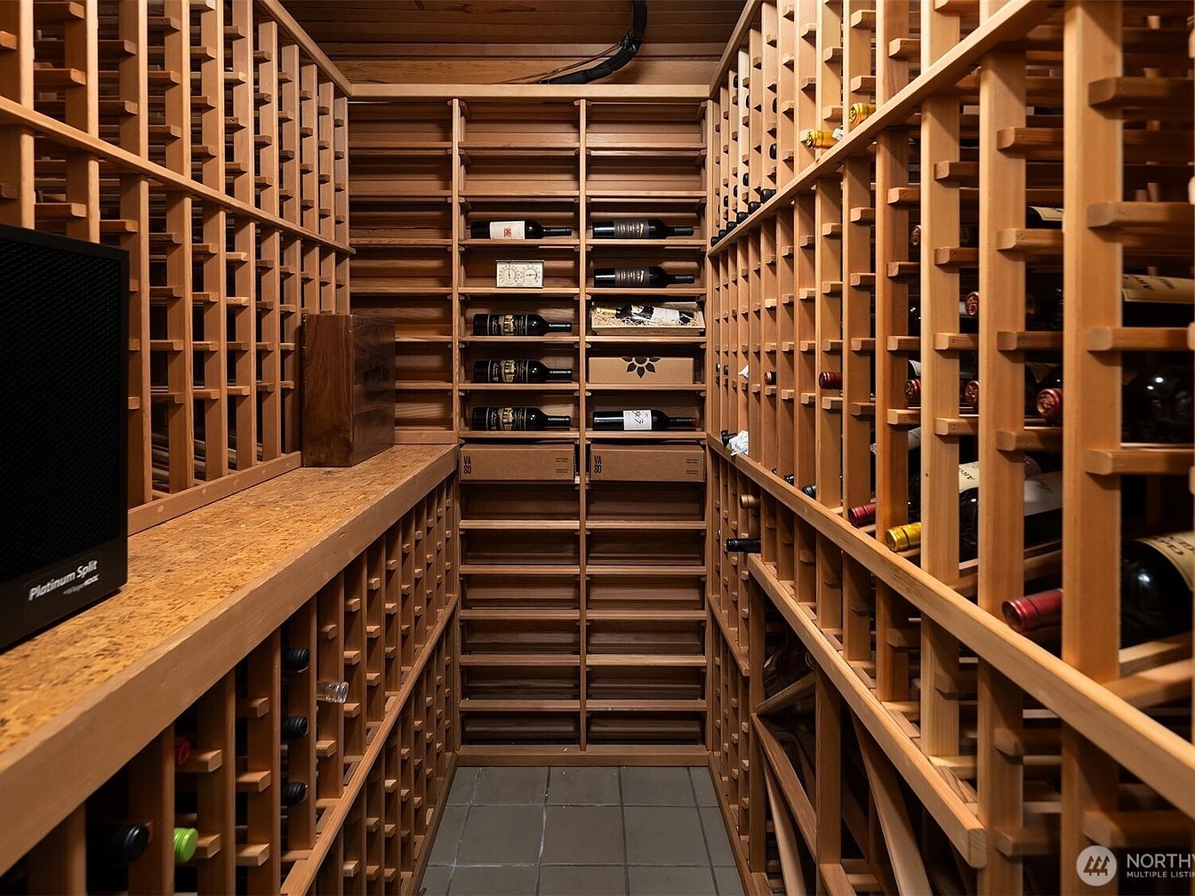 A dedicated wine cellar features floor-to-ceiling custom wood racking designed to securely store a variety of wine bottles. The space is efficiently laid out with a combination of horizontal shelves and individual bottle slots, optimizing capacity while maintaining accessibility. Warm wood tones create a rich and inviting ambiance, complemented by clean-lined craftsmanship. The narrow aisle encourages careful movement, suitable for adult gatherings or family celebrations. The countertop along the left wall offers a convenient workspace for sorting or showcasing bottles. Subtle lighting and tile flooring enhance functionality, making this an ideal setting for aficionados and entertainers alike.