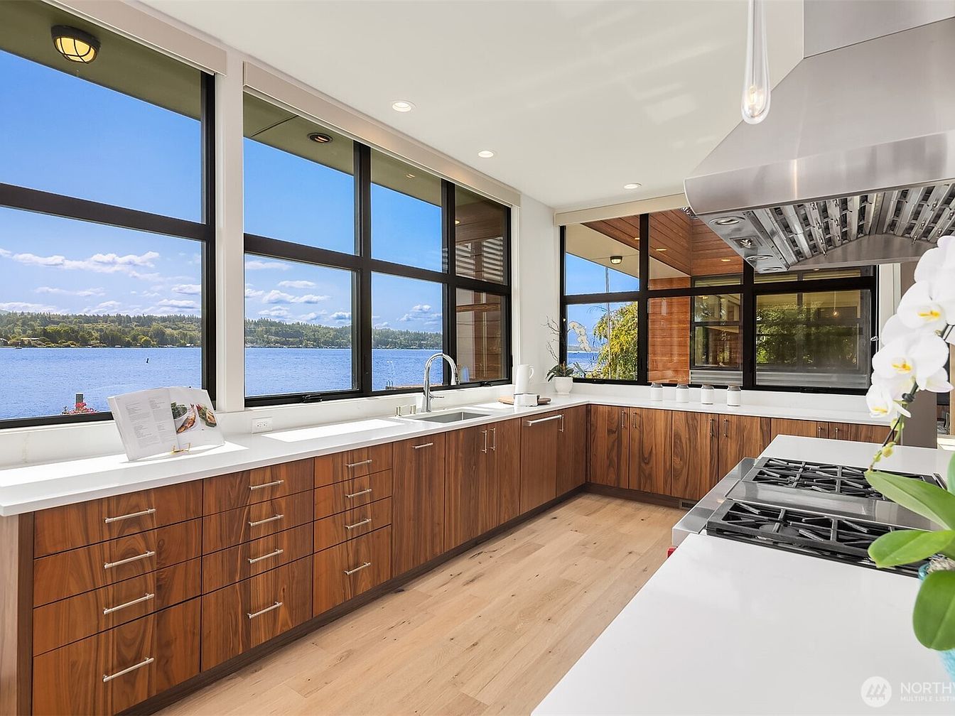 Expansive windows frame stunning waterfront views, bathing the kitchen in natural light and creating an open, airy atmosphere. Sleek white countertops pair beautifully with flat-panel wooden cabinetry for a modern yet warm feel. The spacious layout, with plentiful storage and broad prep areas, is ideal for families or entertaining guests. Stainless steel appliances, including a professional-grade range, add contemporary function, while light-toned hardwood floors provide continuity throughout the space. Thoughtfully arranged accessories and a bright orchid on the island add subtle elegance, making this kitchen both practical and welcoming for daily living or special gatherings.
