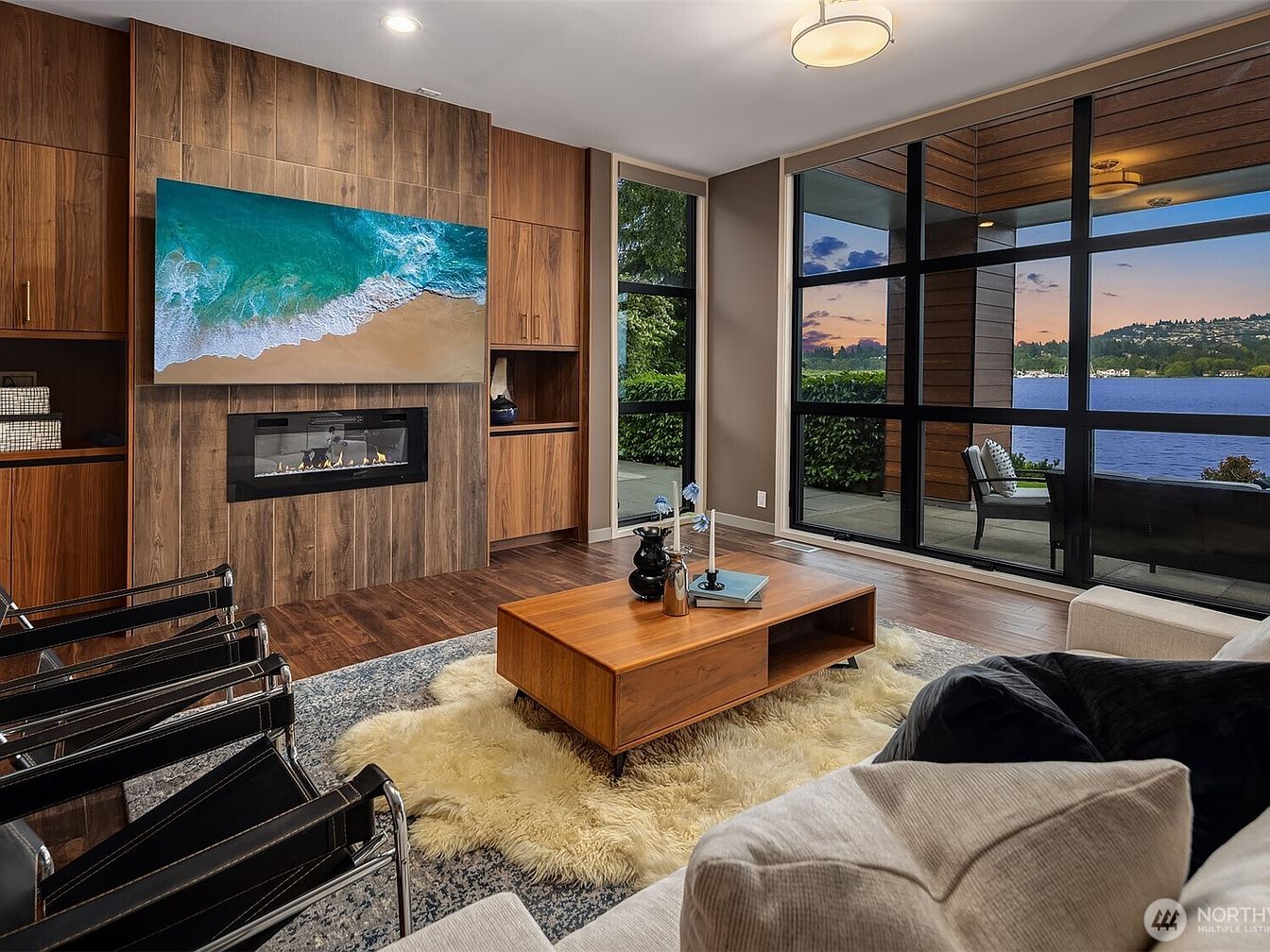 This stunning Mercer Island modernist home is a prime symbol of status and success, featuring a remarkable combination of custom construction and a comprehensive recent remodel aimed at refined, future-oriented living. With 154 feet of prime lakefront, a newly re-decked deepwater dock, covered boat lift, and seamless indoor-outdoor living via expansive nana doors, it caters to those seeking both prestige and innovation. Its clean-lined architectural style, soaring ceilings, walls of windows, gourmet kitchen, new fixtures, and elevator set it apart. Located in the desirable Northend, ideal for an executive commute, this $10,300,000 property provides five bedrooms (including a luxe owner’s suite), five bathrooms, an office, gym, and extensive entertaining spaces all oriented to breathtaking panoramic lake and mountain views.