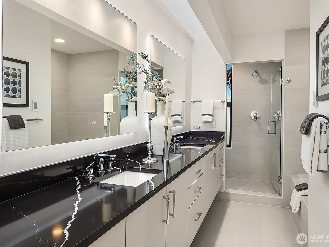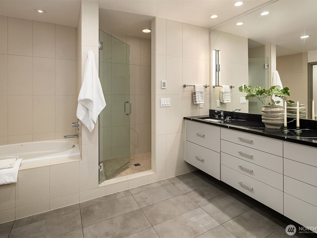 Spacious and elegant, this bathroom features a harmonious blend of soft beige tiles and sleek gray flooring for a calming effect. The walk-in glass shower is situated next to a comfortable soaking tub, while ample cabinetry provides plenty of storage for family essentials. The expansive vanity boasts a black countertop, double sinks, and generously sized drawers, catering to practical family needs. Modern lighting fixtures and a large mirrored wall ensure a bright, inviting space. Thoughtful accents such as potted greenery and tall candles introduce a touch of warmth and homey comfort, making it both functional and stylish for daily use.