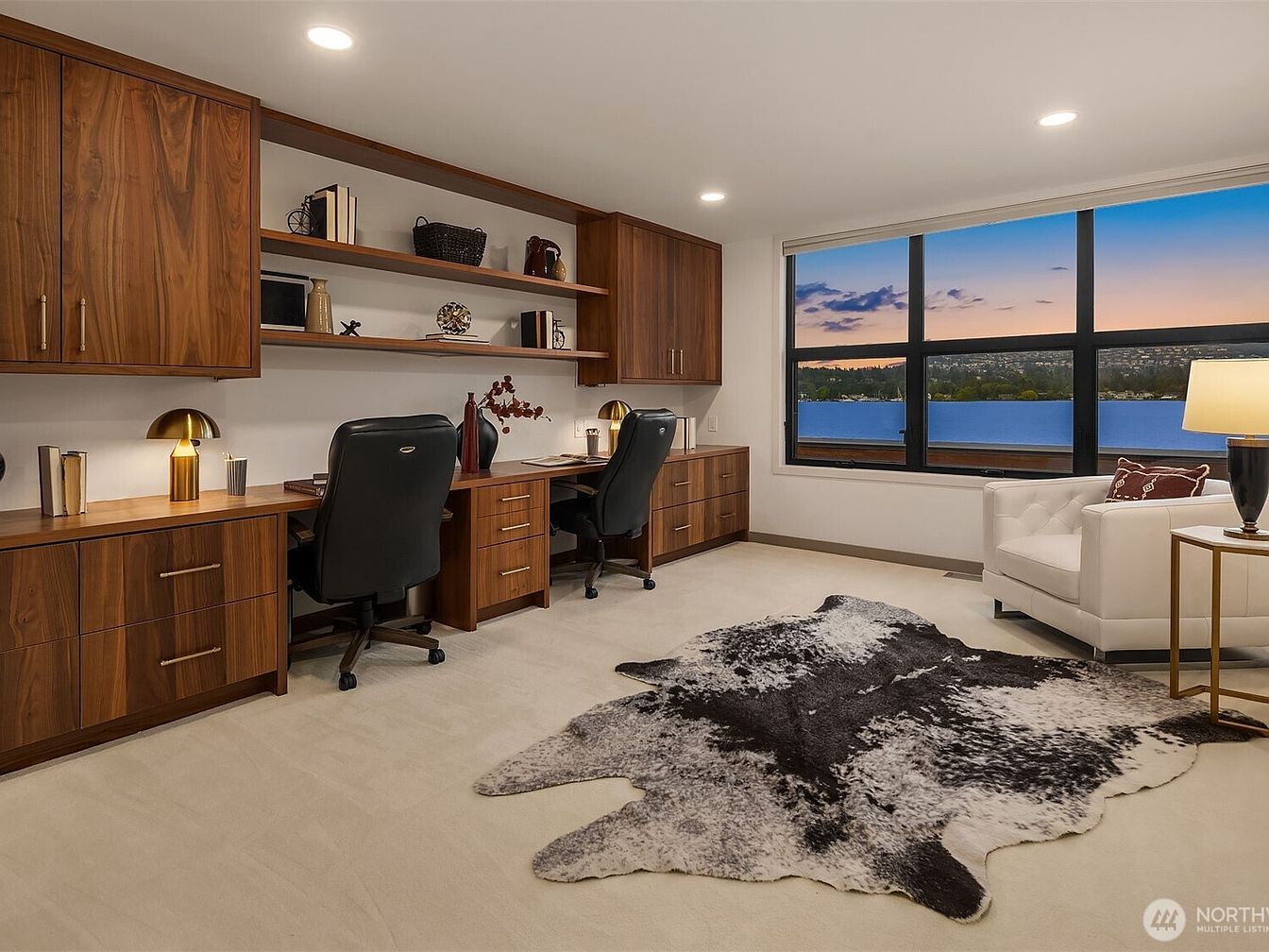 A spacious and sophisticated home office features built-in wooden cabinetry and dual workstations, making it ideal for both adults and children to work or study together. Open shelving above the desks allows for ample storage and stylish display of books and decorative items, while gold-accented lamps add a touch of elegance. Plush neutral carpeting paired with a striking black-and-white area rug creates a warm and inviting atmosphere. Flooded with natural light from a large picture window offering stunning lake views, the room includes a cozy tufted white armchair, perfect for reading or relaxing, making the space both functional and family friendly.