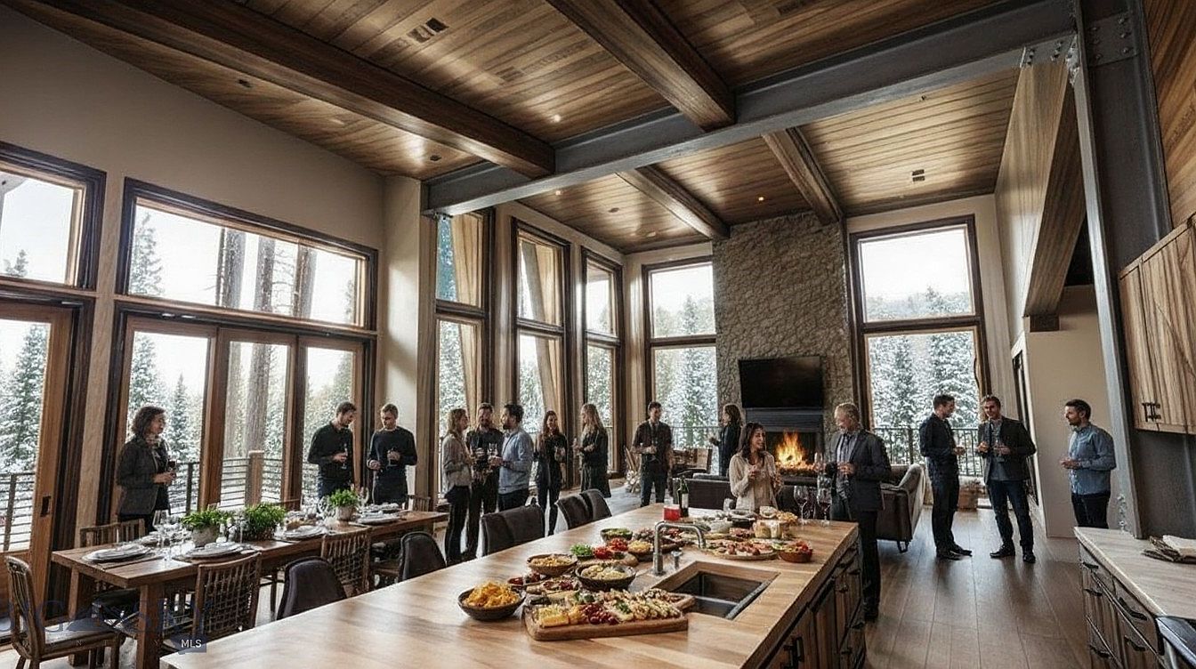 This expansive dining area features a large, elegant wooden table surrounded by a mix of rustic and modern chairs, creating a warm, inviting atmosphere perfect for gatherings. Sunlight floods through oversized windows, highlighting the natural textures of the wooden beams and stone fireplace. Soft, neutral tones in the decor complement the earthy finishes, while contemporary lighting fixtures add a stylish touch. The open layout encourages family interaction, making it ideal for both casual meals and festive occasions. A variety of sumptuous dishes are beautifully displayed, showcasing this space as one designed for both culinary delight and social connection.