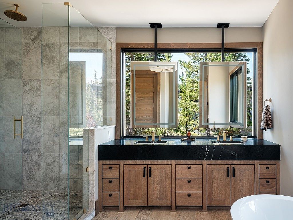 This master bathroom features a striking combination of natural materials and contemporary design. The spacious layout includes a sleek black granite countertop, paired with warm wooden cabinetry that offers ample storage, blending functionality with aesthetic appeal. Two elegant mirrors are suspended above the sinks, framed with matte black fixtures that add a modern touch. A spacious walk-in shower is enclosed with glass, showcasing stunning tile work that complements the rest of the room. Large windows frame serene views, enhancing the space’s tranquility. The overall neutral color palette creates a peaceful, inviting atmosphere for family members.