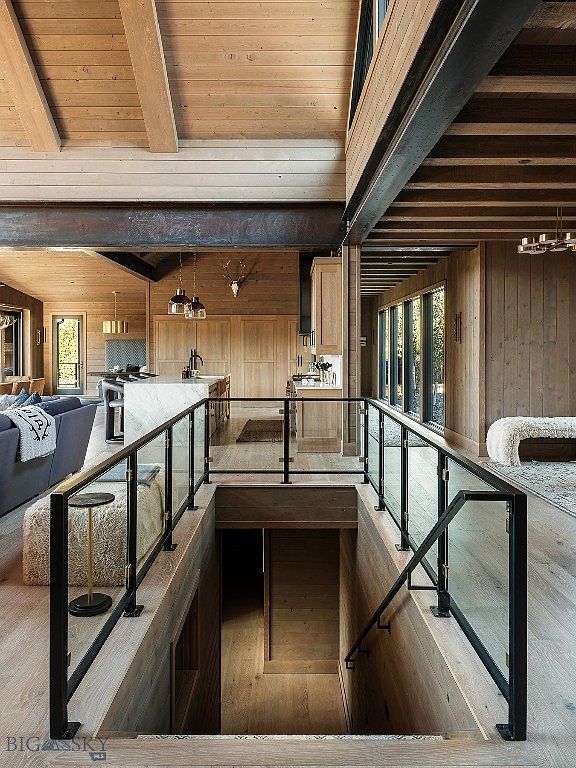 This stunning entryway features a spacious open layout that connects seamlessly to the living area and kitchen, ideal for family gatherings. The high exposed beam ceiling, complemented by rich wooden accents, exudes warmth and rustic charm. A stylish glass railing provides safety while maintaining an airy feel, offering a view into the lower levels. Natural light pours in through expansive windows, enhancing the bright and inviting atmosphere. Contemporary furniture, including a cozy sofa and elegant accent tables, adds a modern touch. The neutral color palette, paired with soft textures, creates a harmonious and welcoming environment.