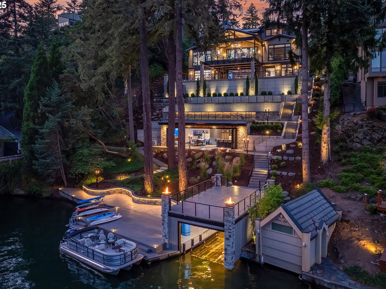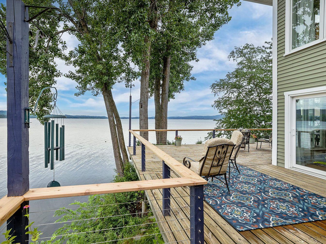 A spacious wooden deck wraps around the side of the house, offering breathtaking views of the lake and lush trees. The seating area is furnished with comfortable cushioned chairs and a vibrant patterned outdoor rug, creating a welcoming spot for relaxation or family gatherings. Stainless steel cables and natural wood railings maintain safety while preserving the open feel. Large sliding glass doors seamlessly connect the deck to the interior, allowing easy access for children and adults alike. Subtle potted plants, a large wind chime, and the tranquil water beyond set a calm, inviting atmosphere for all ages to enjoy.