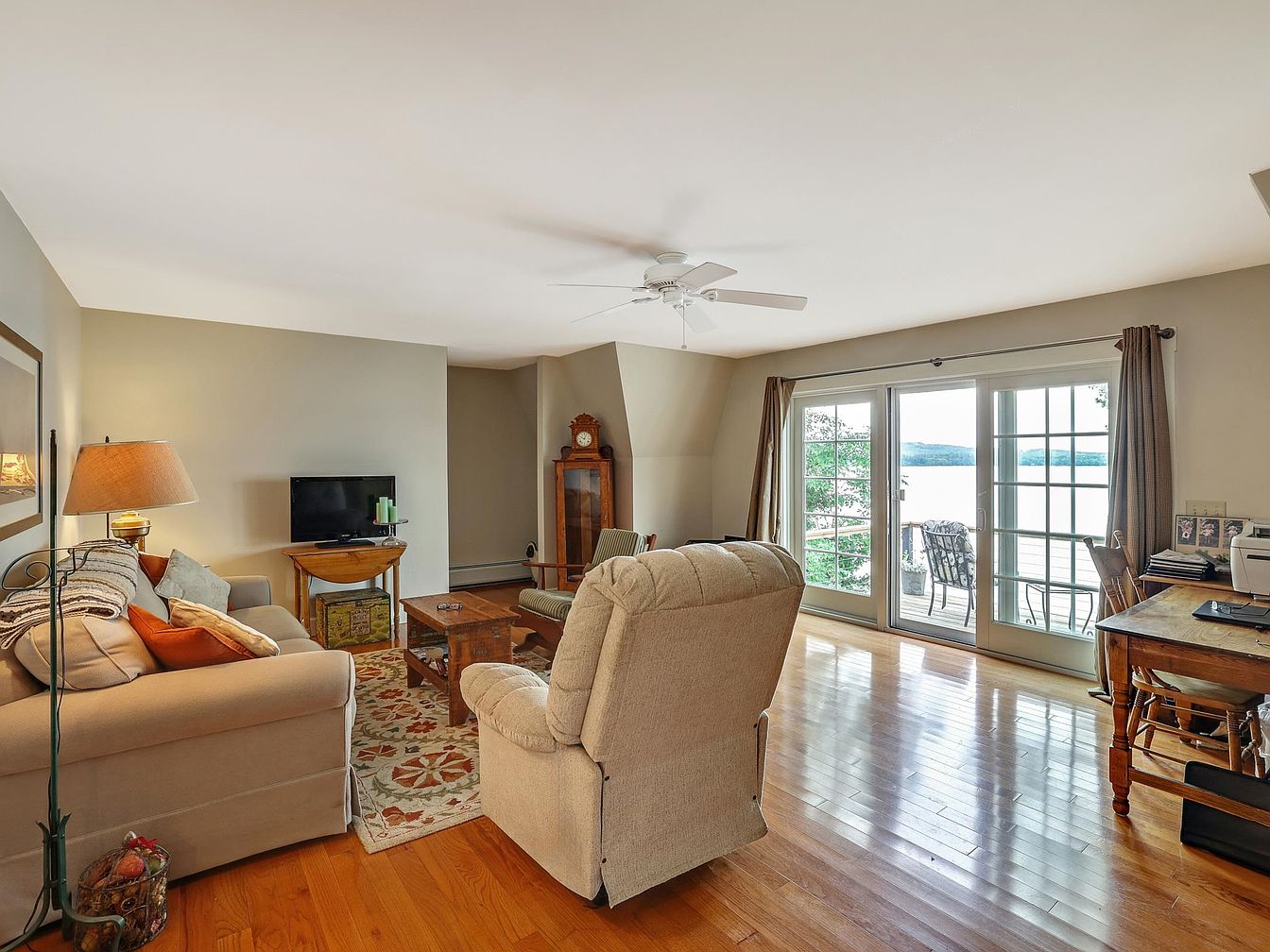 This inviting living room offers an open, airy layout complemented by gleaming hardwood floors and a calming neutral palette. Plush seating options, including a comfortable beige sofa and a reclining armchair, create a cozy gathering space suitable for family nights or entertaining guests. The room is anchored by a patterned area rug, rustic wooden coffee table, and classic grandfather clock, seamlessly blending tradition with comfort. Large sliding glass doors let in abundant natural light and provide stunning views of the lake, while offering direct access to the deck. A functional work desk and a small TV corner complete this family-friendly and versatile space.