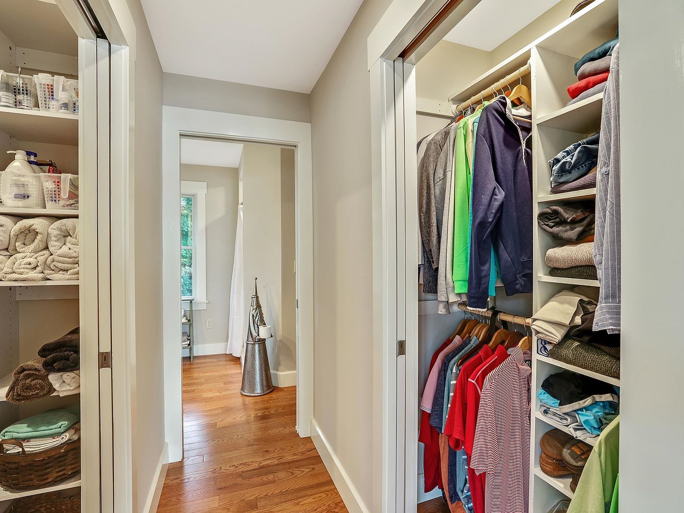 A well-organized hallway closet area features built-in shelving and hanging space on both sides, maximizing storage for clothing, towels, and household essentials. The neutral beige walls and crisp white trim create a calming, versatile backdrop. Warm-toned hardwood flooring adds a sense of coziness, while natural light from an adjoining room brightens the space. Family-friendly open shelving and dividers help keep everything accessible and easily sorted for busy households. The thoughtful layout and uncluttered design make this space practical for everyday living, enhancing both functionality and comfort. Visible access to the bathroom encourages a smooth morning routine for family members.