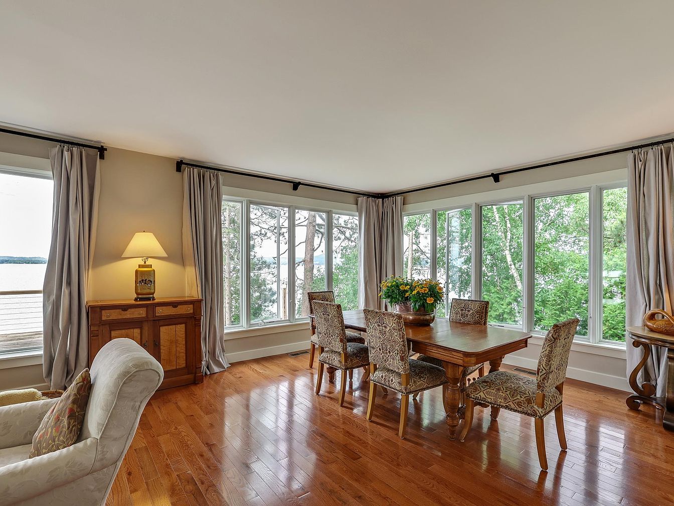 A bright and spacious dining room designed for family gatherings and memorable meals, featuring a solid wood dining table surrounded by six upholstered chairs with intricate patterns. Floor-to-ceiling windows stretch along two sides, flooding the room with natural light and offering stunning views of lush greenery and the lake beyond. Warm hardwood flooring complements the neutral wall color, creating a welcoming and cozy atmosphere. Elegant drapes frame the expansive windows, while a soft armchair and a classic sideboard with a decorative lamp add both comfort and function. The centerpiece is a vibrant potted plant, enhancing the inviting and family-friendly environment.
