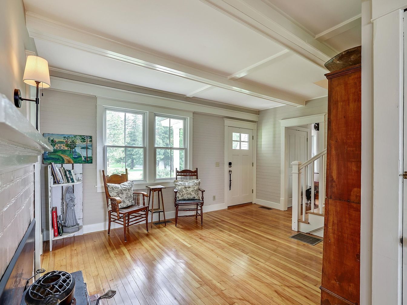 A charming entryway seamlessly opens into a cozy sitting area, illuminated by natural light streaming through large, classic windows. The space features gleaming hardwood floors, light neutral walls, and crisp white trim, creating a bright and inviting atmosphere. Two vintage wooden chairs with plush, patterned cushions offer a welcoming spot for family or guests. The simple, uncluttered layout allows for easy movement, which is perfect for families with children. Architectural detailing like the beamed ceiling and built-in shelves lend character, while tasteful decor—including books and artwork—adds personality without overwhelming the calm ambiance.
