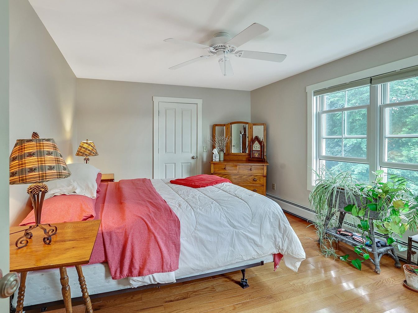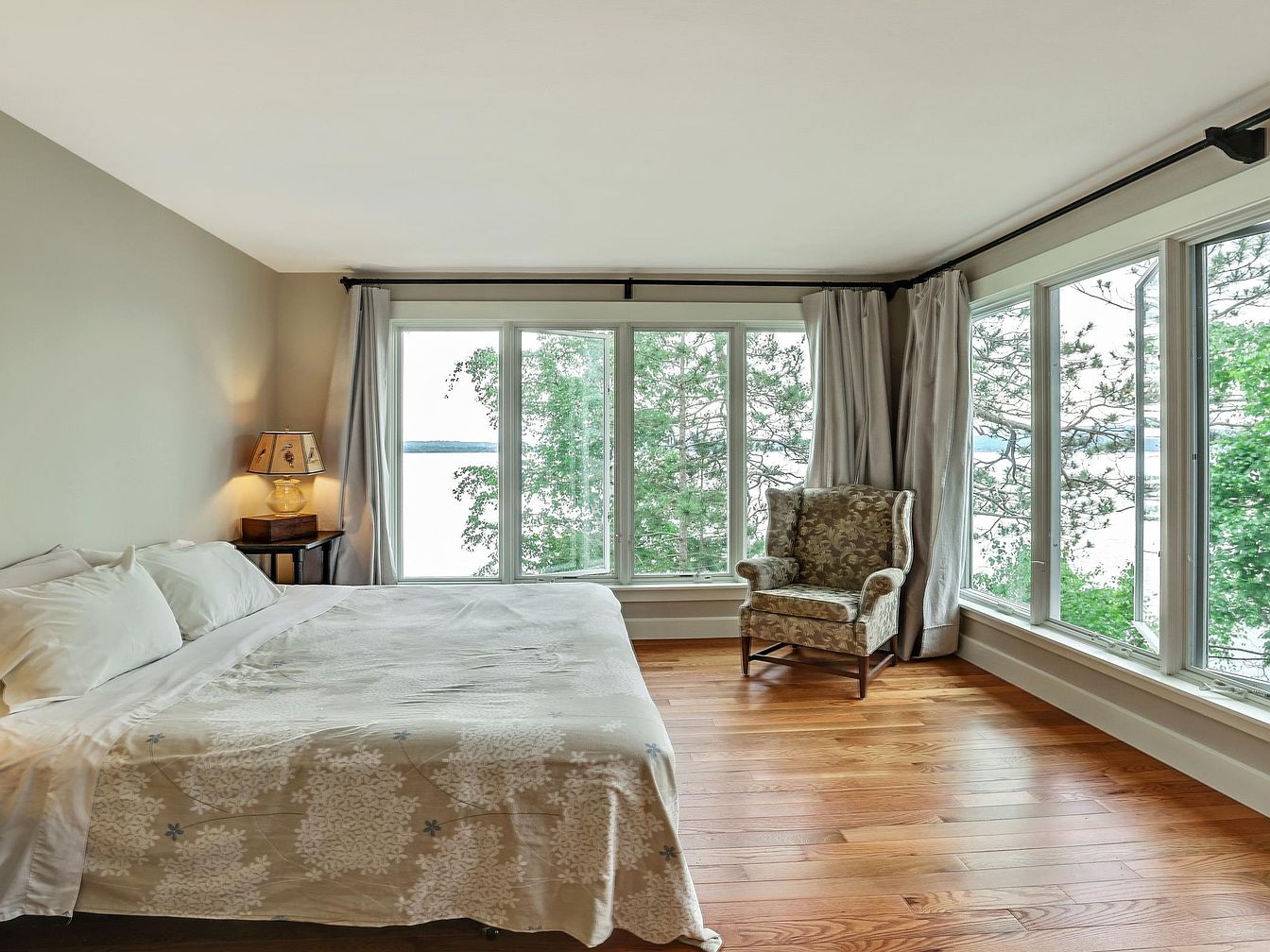 A bright, spacious bedroom features expansive windows offering unobstructed views of a serene lakeside landscape, creating a calming retreat filled with natural light. The room’s layout emphasizes relaxation, with a king-size bed adorned in soft, neutral bedding, set beside a warm wooden nightstand topped with a decorative lamp. A comfortable upholstered armchair sits in the corner, perfect for reading or enjoying the surrounding scenery. The hardwood flooring adds warmth and elegance, while taupe walls and simple gray curtains maintain a tranquil, family-friendly ambiance. Ample floor space allows for play or extra furnishings, making it ideal for couples or parents with young children.