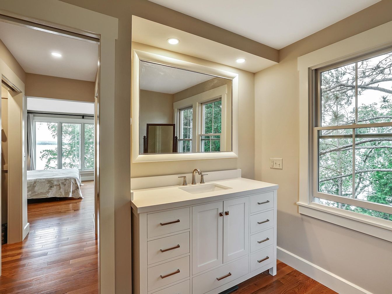 A spacious bathroom vanity area with a contemporary design, featuring a large mirror framed by elegant trim and illuminated by recessed ceiling lights. The crisp white cabinetry with brushed nickel handles provides ample storage, making it practical for family use. Natural light streams through the generously-sized window, offering a refreshing view of the surrounding greenery. The soft beige walls and warm hardwood floors create a welcoming and serene atmosphere, coordinating seamlessly with the nearby bedroom visible through an open doorway. The design highlights both functionality and comfort, creating an inviting and family-friendly space ideal for daily routines.