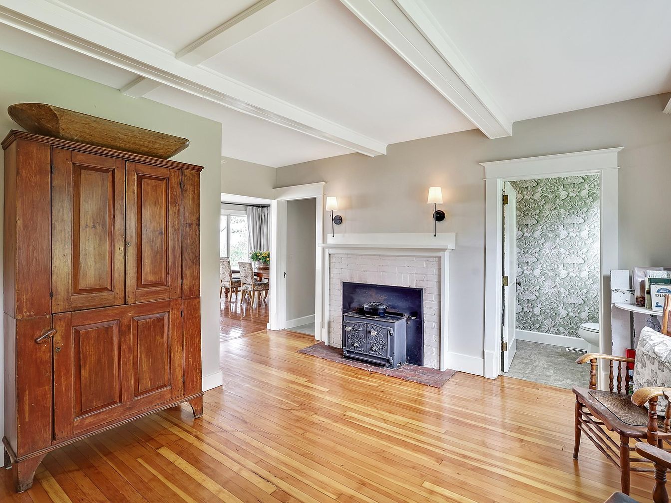 Warm and inviting, this living room centers around a classic white brick fireplace with a wood stove insert, perfect for cozy family evenings. Exposed ceiling beams provide subtle architectural interest, while natural wood floors add character and warmth underfoot. A large wooden armoire offers practical storage and a rustic touch, complemented by a traditional spindle-back chair. The neutral backdrop, with soft gray walls, seamlessly connects to the adjacent dining area, enhancing the home’s open feel. Sconces above the mantel softly illuminate the space, making it both elegant and functional for gatherings or quiet moments alike.
