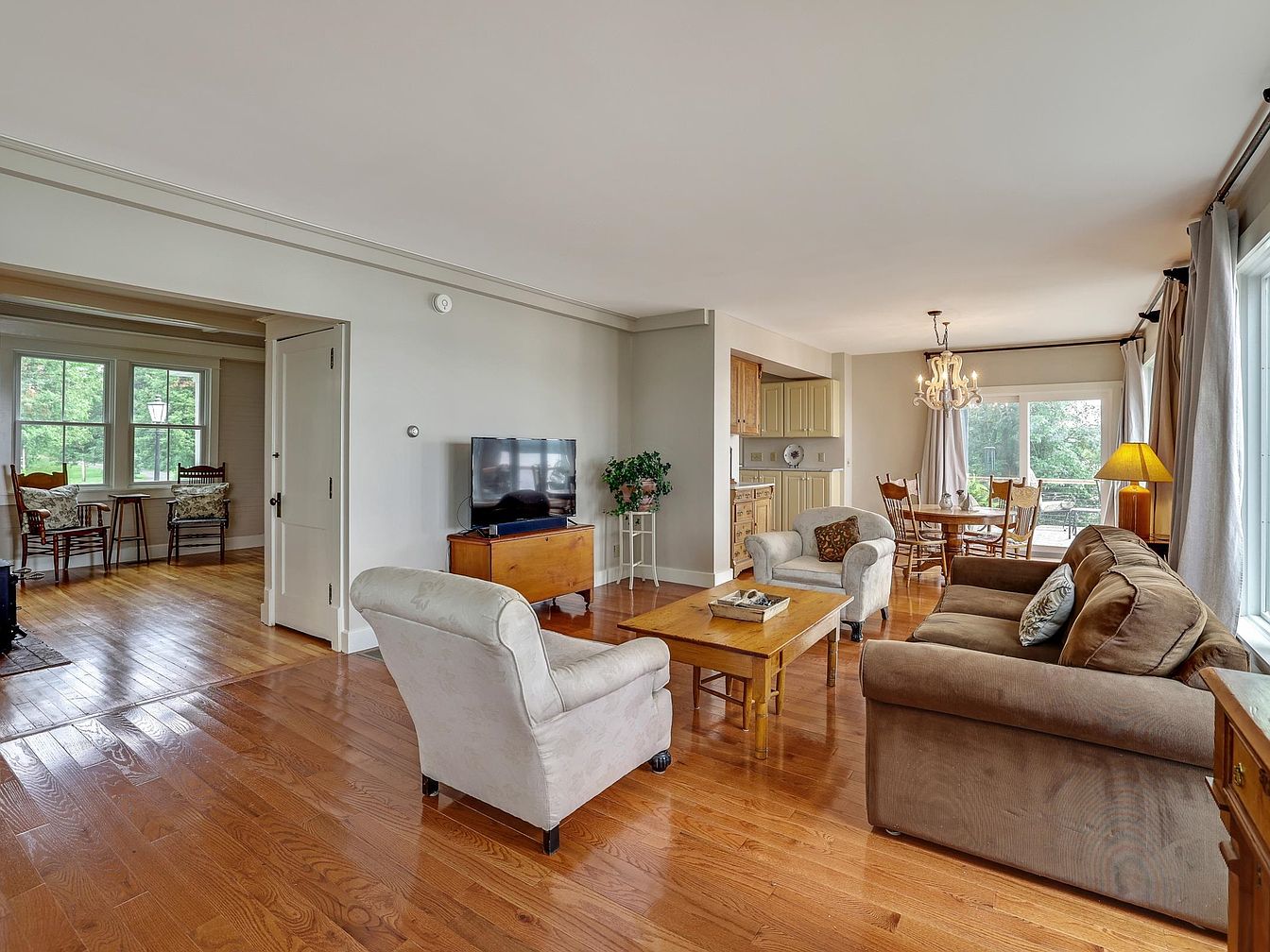 This inviting open-concept living and dining area combines comfort and functionality, making it perfect for family gatherings and everyday life. Warm hardwood flooring extends throughout the space, enhancing the bright, airy feel created by large windows and soft neutral-toned walls. The living room features plush seating, including a cozy brown sofa and light armchairs arranged around a wood coffee table, ideal for relaxed conversation or movie nights. The adjacent dining nook, illuminated by a statement chandelier, flows seamlessly into the kitchen. Generous natural light, practical furniture, and thoughtful layout offer a harmonious setting for both entertaining and unwinding.