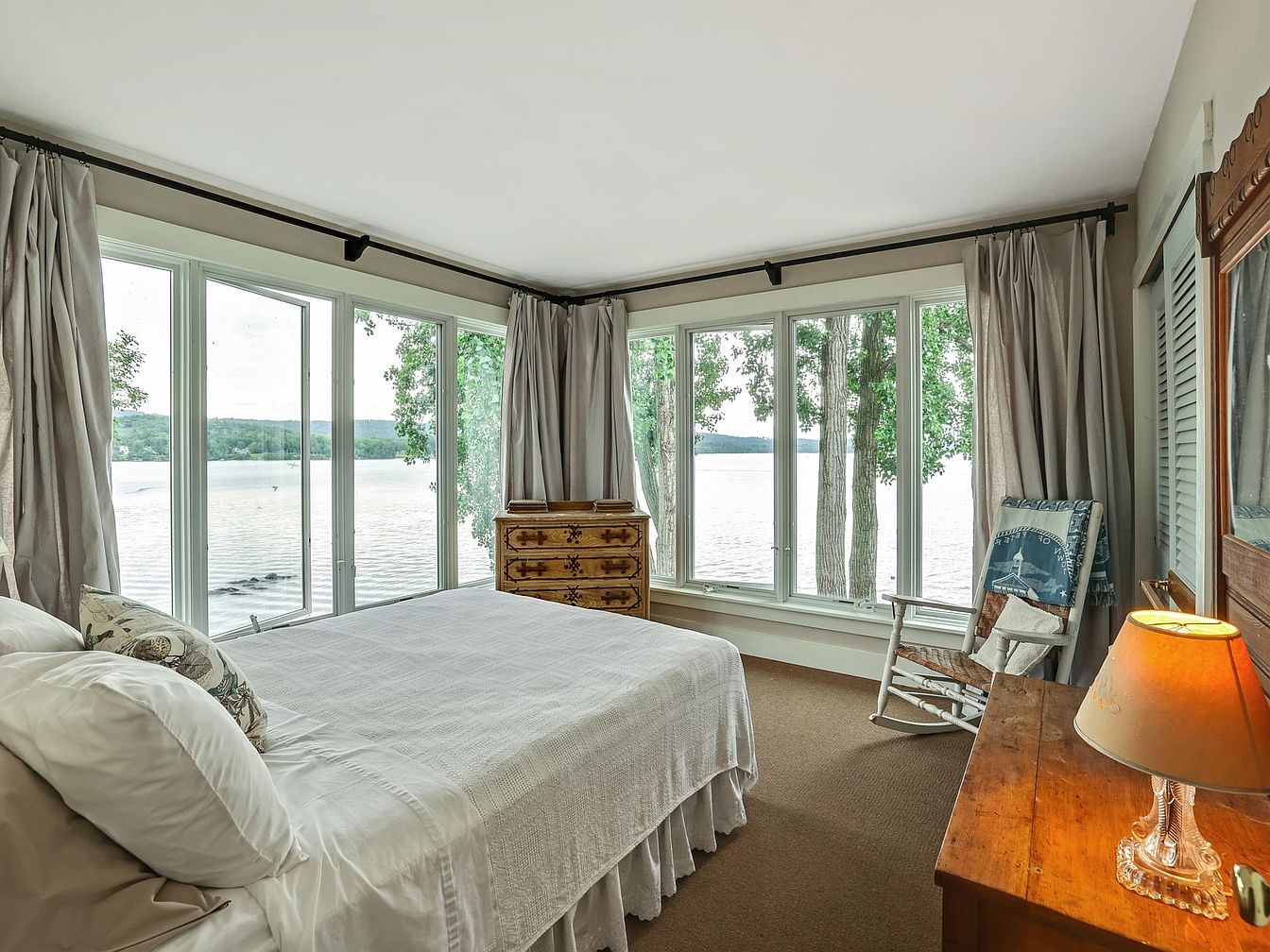 Serene and spacious, this bedroom features floor-to-ceiling windows offering stunning panoramic views of a peaceful lake and lush greenery. Natural light fills the room, highlighting the neutral color palette of soft whites and beiges, creating a calm and inviting retreat. Furnished with a cozy queen bed, a vintage wooden dresser, and a charming rocking chair, the space feels both comfortable and family-friendly. Elegant drapes frame the windows for privacy when needed. Warm accents, such as a bedside lamp and decorative pillows, enhance the homey atmosphere, making this bedroom a tranquil escape for rest and relaxation.