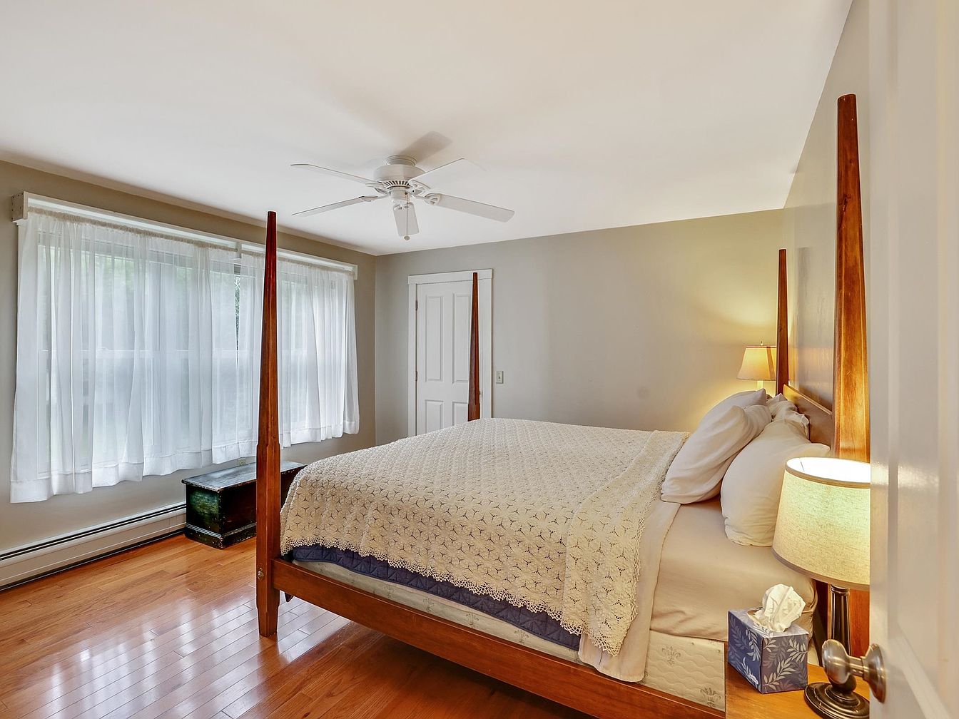 A serene bedroom featuring a classic four-poster wooden bed as its centerpiece, complemented by soft, creamy bedding and cozy pillows. Plentiful natural light streams through sheer white curtains, brightening the neutral-toned walls and glossy hardwood floor. A ceiling fan ensures comfort for restful nights, while bedside lamps offer gentle lighting for reading or relaxation. A vintage-style hope chest sits under the window, adding both charm and storage space. The layout promotes tranquility and family comfort, with ample room to move around and easy access to the closet, creating an inviting and relaxing atmosphere perfect for winding down at the end of the day.