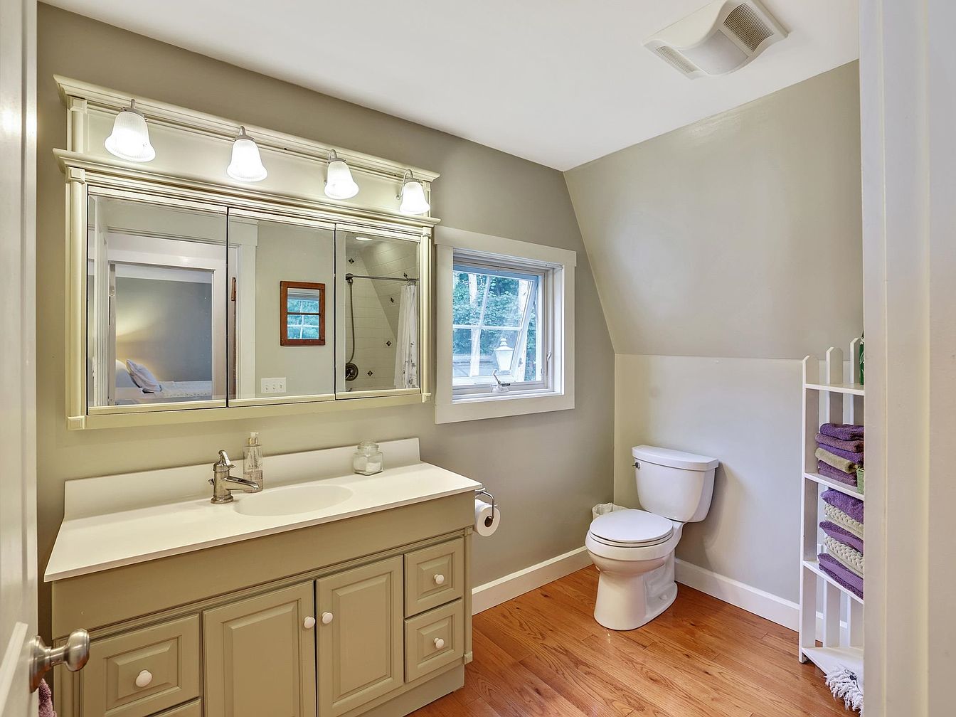 This bright and welcoming bathroom features a spacious vanity with ample storage, a wide countertop, and a large mirrored cabinet above, framed by elegant lighting fixtures that provide abundant illumination. The walls are painted in a soft, warm beige that pairs nicely with the crisp white trim and cabinetry. A window brings in natural light, making the room feel airy and fresh. Family-friendly amenities include accessible towel shelving with neatly folded colorful towels, durable hardwood flooring, and easy access to both sink and toilet. The simple, neutral palette and classic fixtures create a timeless, relaxing atmosphere for everyday use.