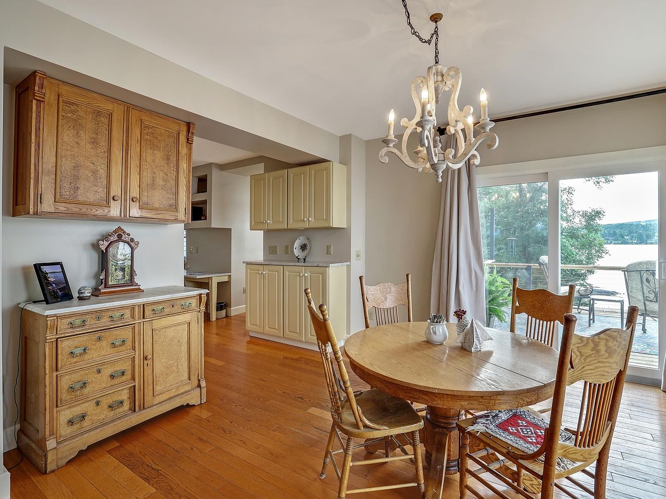 Warm and welcoming, this dining area blends rustic charm with contemporary elegance. A sturdy wooden round table and high-back chairs create an inviting space for family meals, while the large sliding glass doors allow natural light to flood the room and offer stunning lake views. The soft cream cabinetry and neutral-toned walls enhance the open, airy feel, perfect for gatherings. Hardwood floors and vintage wooden cabinetry add character, while a decorative chandelier overhead lends a touch of sophistication. With easy access to the patio, this space promotes indoor-outdoor living, ideal for families who cherish relaxed entertaining and beautiful scenery.