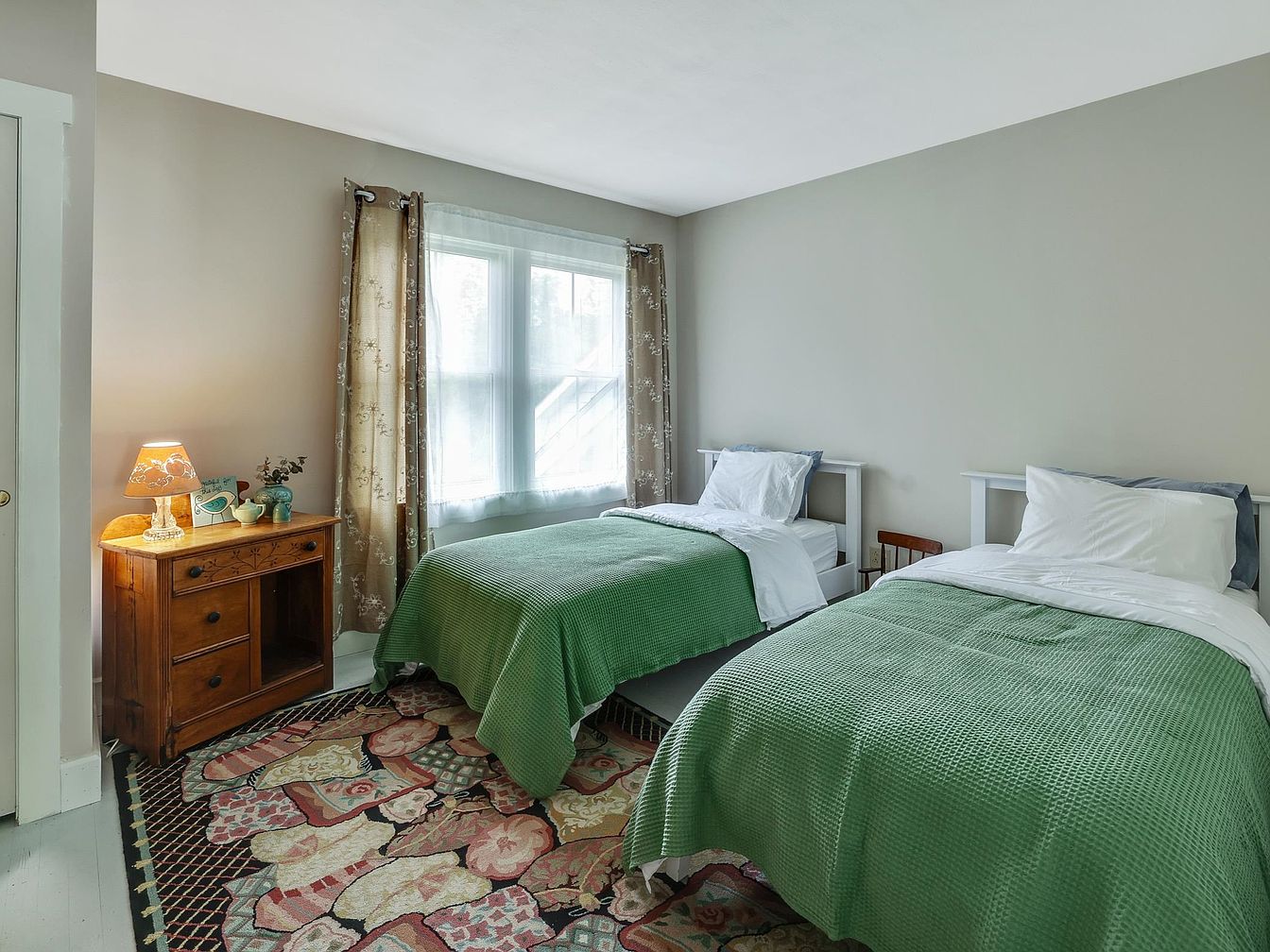 Bright and welcoming, this twin bedroom offers the perfect blend of coziness and practicality for families or guests. Two neatly made twin beds feature fresh white linens topped with sage green blankets, emphasizing a refreshing and restful palette. The space is softened by taupe walls and a large window dressed in sheer white and floral tan curtains, maximizing natural light and creating a tranquil atmosphere. An intricate area rug with rich patterns adds visual interest, while a wooden nightstand with vintage accents and a cheerful lamp offers warmth and personality. The thoughtful layout ensures comfort, privacy, and a sense of home for all ages.