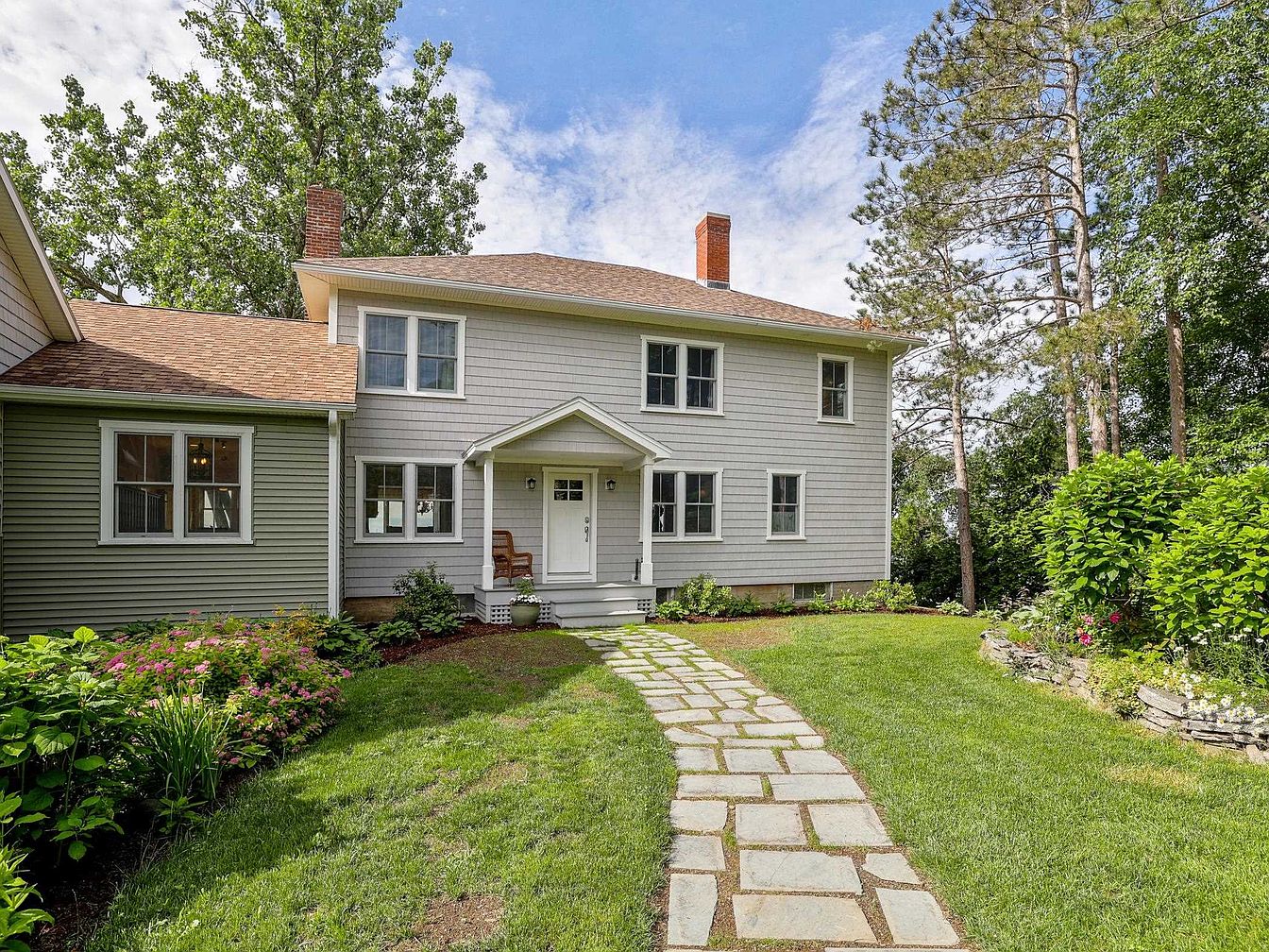 A charming front yard showcases a welcoming stone walkway leading directly to a cozy covered porch, perfectly suited for family living. Lush green lawns and thoughtfully arranged flowerbeds frame the path, adding color and vitality while creating a safe play space for children. The exterior features soothing, neutral siding with white trim, balanced by two brick chimneys that enhance the home’s classic American appeal. Tall trees and mature landscaping offer privacy and shade, while the porch provides a comfortable spot to relax outdoors. The overall design blends timeless architecture with inviting, family-friendly landscaping for everyday enjoyment.