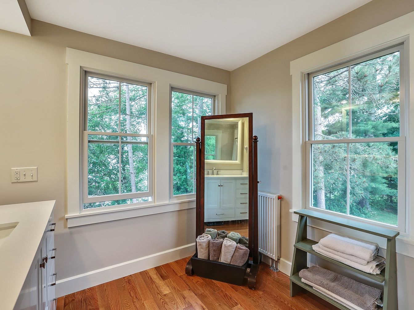 A bright and inviting bathroom corner features large windows that flood the space with natural light and offer tranquil views of lush greenery outside. The corner is thoughtfully organized with a freestanding full-length mirror, doubling as a practical accent and enhancing the sense of spaciousness. Below the mirror, neatly rolled towels are arranged for easy access, while an open shelving unit nearby provides additional storage for family essentials such as extra towels and linens. Warm oak flooring contrasts gently with the soft beige walls and white trim, creating a cozy yet fresh atmosphere ideal for a family-oriented home.