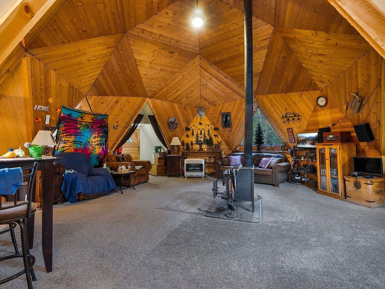 This unique triangular living area features a warm wood-paneled interior, creating a welcoming and rustic ambiance. The geometric design enhances the room’s spaciousness, while cozy carpeting underfoot ensures comfort for family gatherings. A colorful tapestry adorns the seating area, providing a vibrant contrast to the rich wooden tones. Plush couches invite relaxation, and a central wood stove adds both warmth and charm, making it perfect for family nights. Strategically placed windows offer glimpses of nature, while various decorative elements, such as wall art and soft lighting, create an inviting space ideal for both entertaining and everyday living.