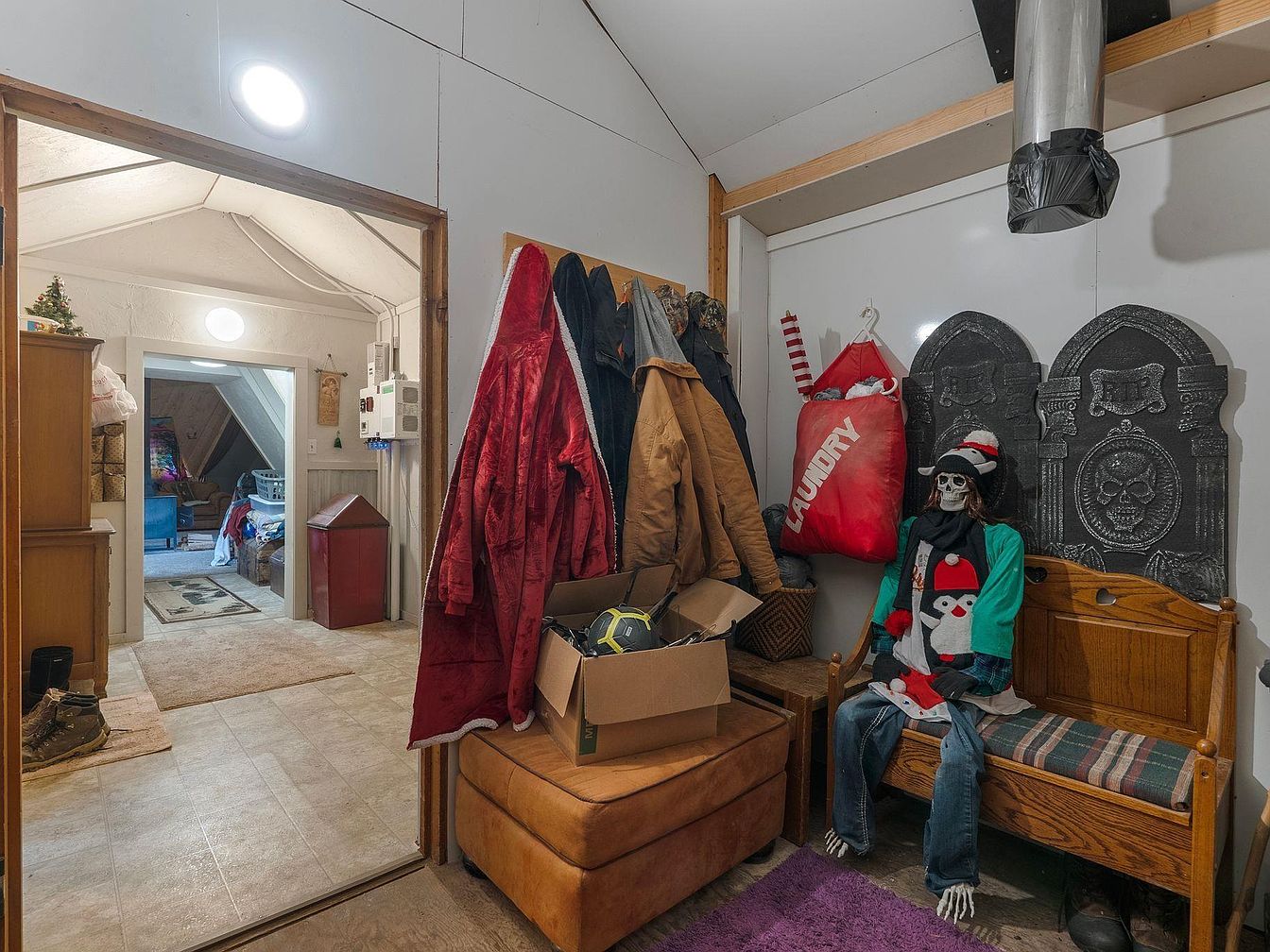 This inviting entryway blends functionality and quirky charm, serving as a welcoming space for guests. A combination of practical storage solutions, including a wooden bench and hooks for coats, ensures organization. The soft, neutral color scheme is enhanced by natural light filtering through the overhead windows, creating a warm atmosphere. Children’s playful decorations, like a snowman-clad mannequin and colorful laundry bags, add a family-friendly touch. The textured flooring pairs with a plush area rug that defines the space, while wooden accents and wall-mounted artwork imbue character, making this entryway a delightful glimpse into the home’s personality.