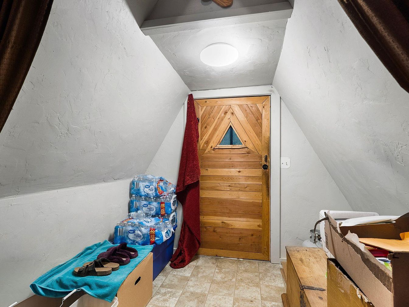 This inviting entryway features a charming sloped ceiling, enhancing the cozy atmosphere. The walls are adorned in a soft, light gray that creates a bright and airy feel. A unique wooden door with a diamond-shaped window adds a rustic touch, harmonizing with the home’s overall aesthetic. Practical elements include a bench for convenient seating, while the turquoise throw draped atop it introduces a pop of color. Boxes of supplies and a stack of water bottles reflect a family-friendly design, making it functional and organized. The space is both a warm welcome and a utilitarian hub that emphasizes comfort.