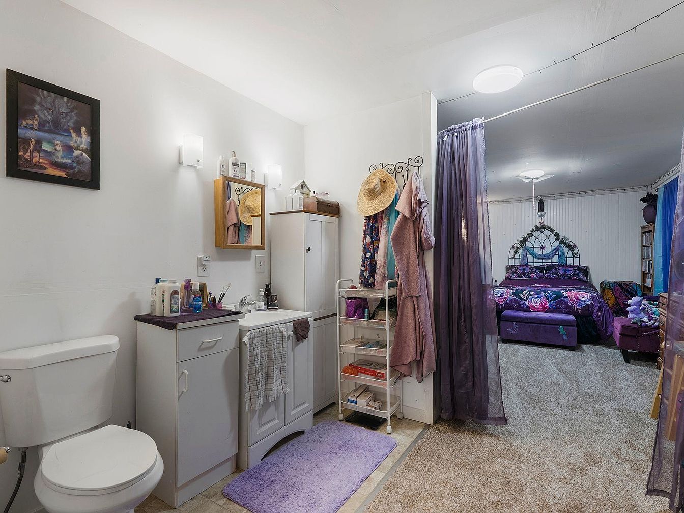 A cozy, multifunctional bathroom and bedroom space designed with comfort in mind. The layout features a compact yet efficient bathroom area with essential fixtures, including a toilet and sink, adorned with soft lighting and a touch of personality through wall art and minimal decor. The adjoining bedroom area showcases a vibrant color scheme dominated by purples and floral patterns, enhanced by ambient lighting. Curtains provide a gentle separation while maintaining openness, ideal for family living. Plush carpets underfoot add warmth, ensuring a welcoming space perfect for relaxation or entertaining guests.