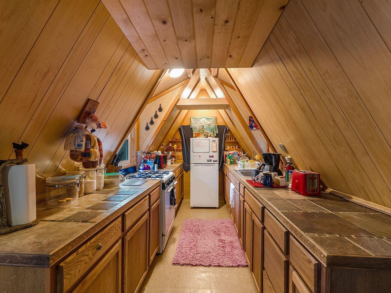 This inviting A-frame kitchen features a cozy and functional layout, accentuated by its distinctive steeply sloped wooden ceiling. Warm wooden cabinetry contrasts beautifully with the multi-toned tiled countertops, creating a rustic yet modern feel. Emphasizing family-friendly features, ample counter space allows for easy meal preparation, while the bright white appliances offer a touch of contemporary elegance. Natural light pours in through angled windows, illuminating the space and highlighting colorful kitchenware and decorative accents. A soft pink area rug adds warmth underfoot, complementing the earthy tones and making this kitchen an ideal gathering place for family and friends.