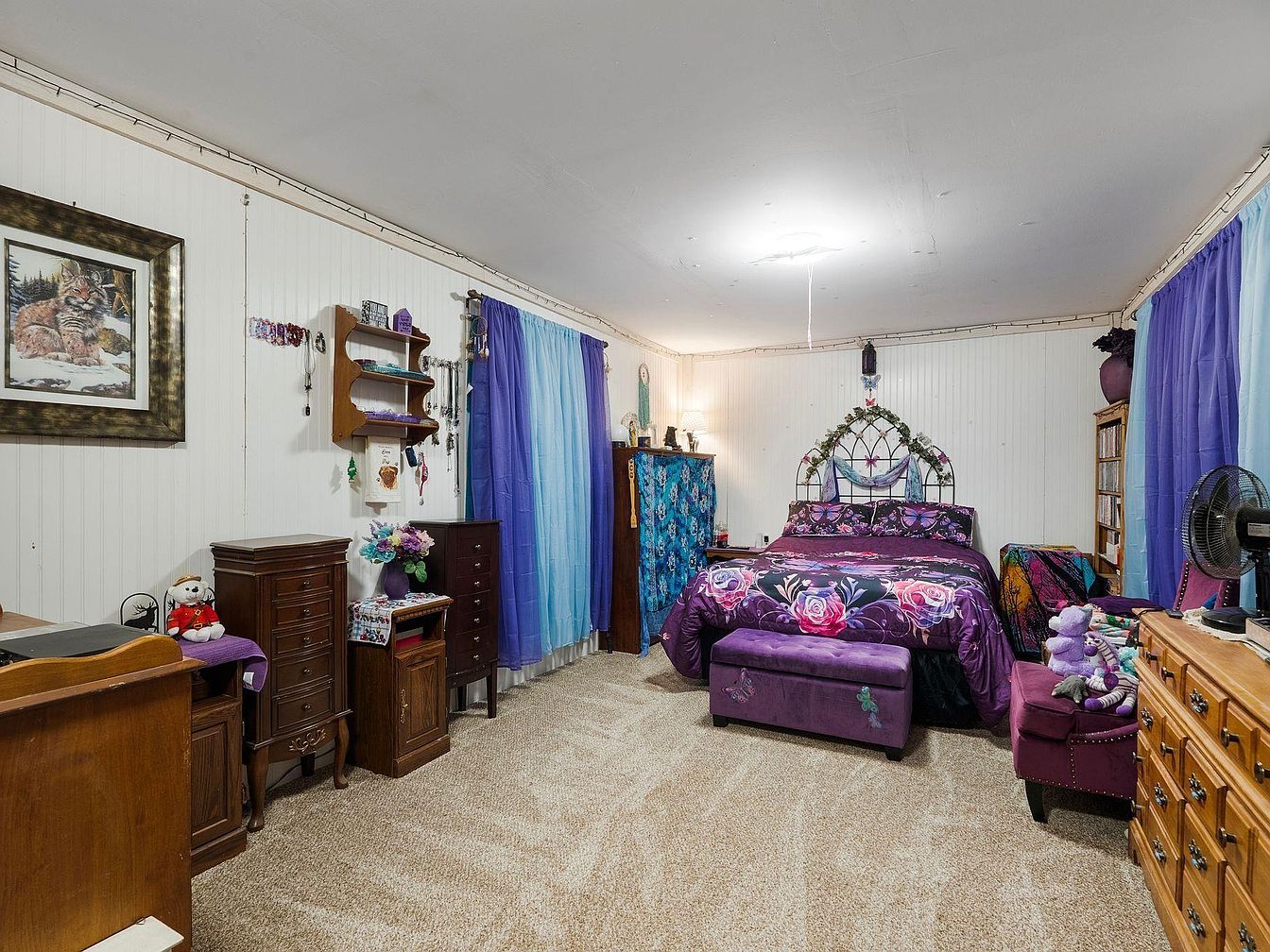 This inviting bedroom features a cozy layout with plush carpeting that adds warmth and comfort. The bold color scheme showcases rich purples and vibrant floral patterns on the bedding, complemented by soft blue curtains that frame the windows. A decorative headboard adorned with greenery enhances the charm, while artistic wall accents, including a framed wildlife print, bring character to the space. Storage is ample with elegant wooden dressers and shelves. Family-friendly elements, like the plush toys and soft seating options, create a welcoming atmosphere, making this bedroom a perfect retreat for relaxation and personal expression.