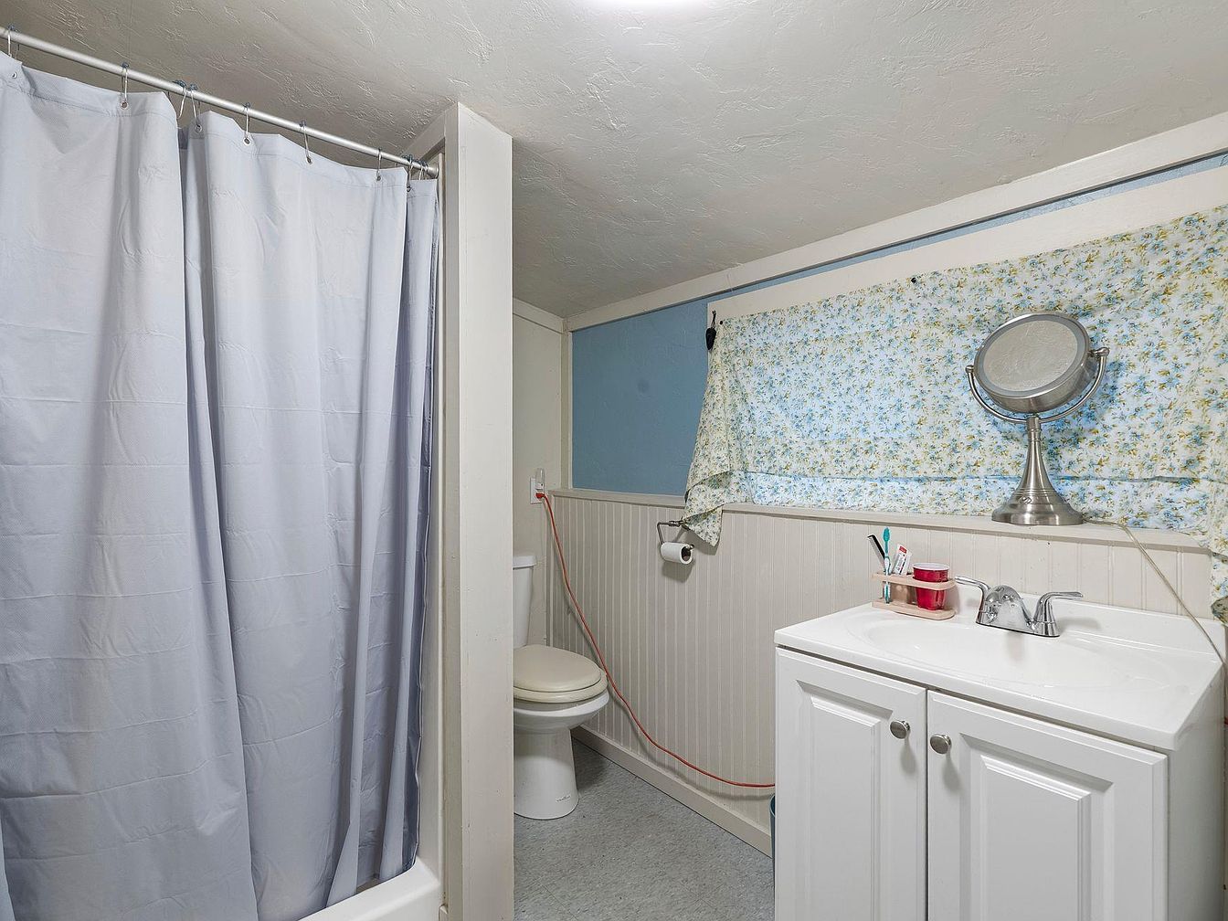 This charming bathroom features a compact yet functional layout, designed for comfort and ease. A light blue wall complements the white beadboard paneling, creating a fresh and inviting atmosphere. The white vanity, with sleek cabinets, provides ample storage while the polished mirror enhances the sense of space. A shower with a gentle gray curtain offers privacy and practicality. The window is adorned with a floral fabric, adding a touch of warmth. Family-friendly elements, like easy-clean surfaces and accessible fixtures, make this space ideal for daily routines, striking a balance between style and functionality.