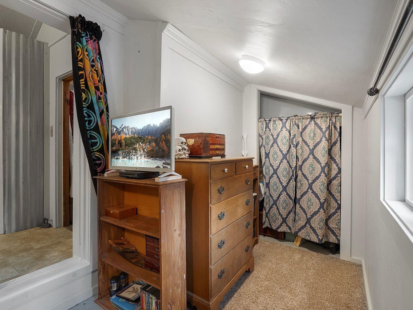This inviting corner nook showcases a blend of comfort and functionality. A warm, light color palette creates a tranquil atmosphere, while a plush carpet offers a soft underfoot experience. The vintage wooden dresser adds character, featuring detailed drawer pulls that evoke a sense of nostalgia. Adjacent, a colorful curtain provides a playful touch, separating spaces with vibrancy. A compact television sits atop the dresser, perfect for casual viewing. Ample natural light streams in through the nearby window, enhancing the cozy feel. This nook is thoughtfully designed for relaxation and serves as a welcoming retreat in the home.