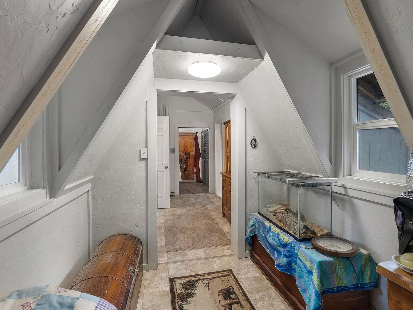 This charming entryway features a unique A-frame design that showcases sloped ceilings and ample natural light streaming through windows. The soft gray walls provide a serene backdrop, paired with a warm wood accent from a vintage trunk and furniture. A cozy rug adds texture underfoot, guiding guests deeper into the home. Family-friendly details include a spacious layout, perfect for welcoming gatherings. A functional fish tank rests on a wooden bench, enhancing the playful atmosphere. The hallway connects seamlessly to additional rooms, ensuring practicality while maintaining an inviting aesthetic, ideal for any family looking to create vibrant memories.