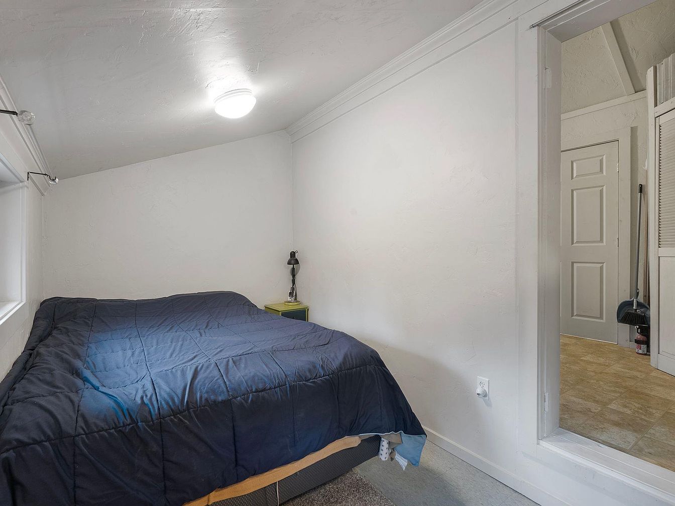 This cozy bedroom features an inviting atmosphere with a slanted ceiling and soft, natural light streaming in from a nearby window. A comfortable blue comforter covers the spacious bed, complemented by a simple green bedside table that adds a pop of color. The walls are painted in a light, neutral tone, enhancing the sense of space and tranquility. Architectural details like the crown molding and clean lines contribute to a modern aesthetic. Family-friendly with a layout that promotes ease of movement, this retreat is perfect for relaxation while maintaining a functional, stylish design.