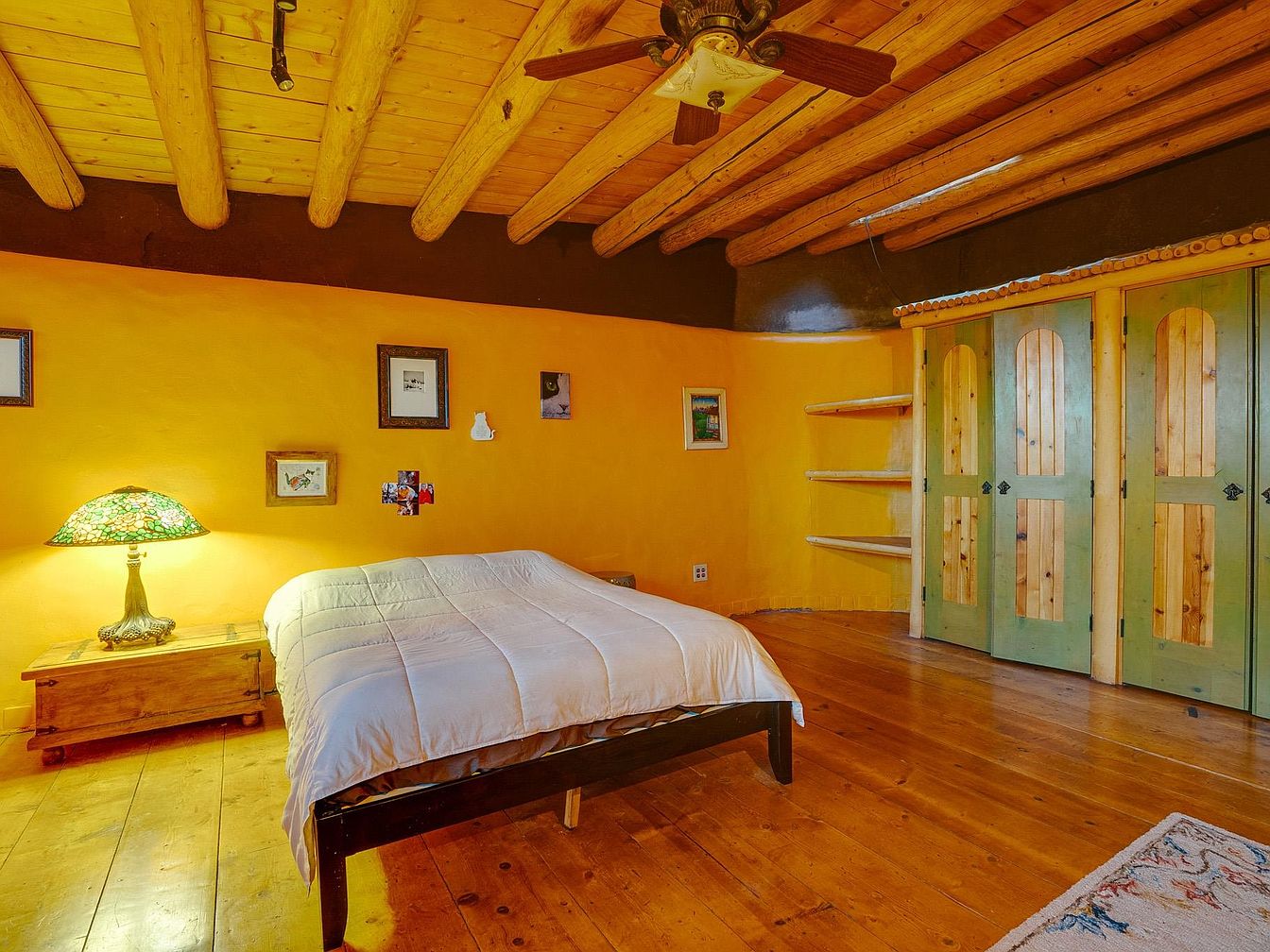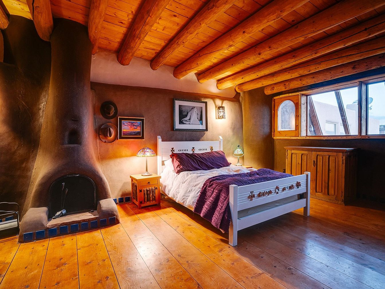 This inviting master bedroom exudes warmth and charm, featuring exposed wooden beams that enhance its rustic appeal. The adobe-inspired fireplace serves as a striking focal point, providing both comfort and a cozy atmosphere. A crisp white bed adorned with a textured purple throw invites relaxation, while vintage lamps add soft ambient light. Natural wood flooring complements the earthy color palette, creating a serene environment. Characteristic arched windows frame beautiful views, letting in ample natural light. The carefully curated artwork and decorative accents reflect a blend of personality and style, making this space perfect for restful retreat.