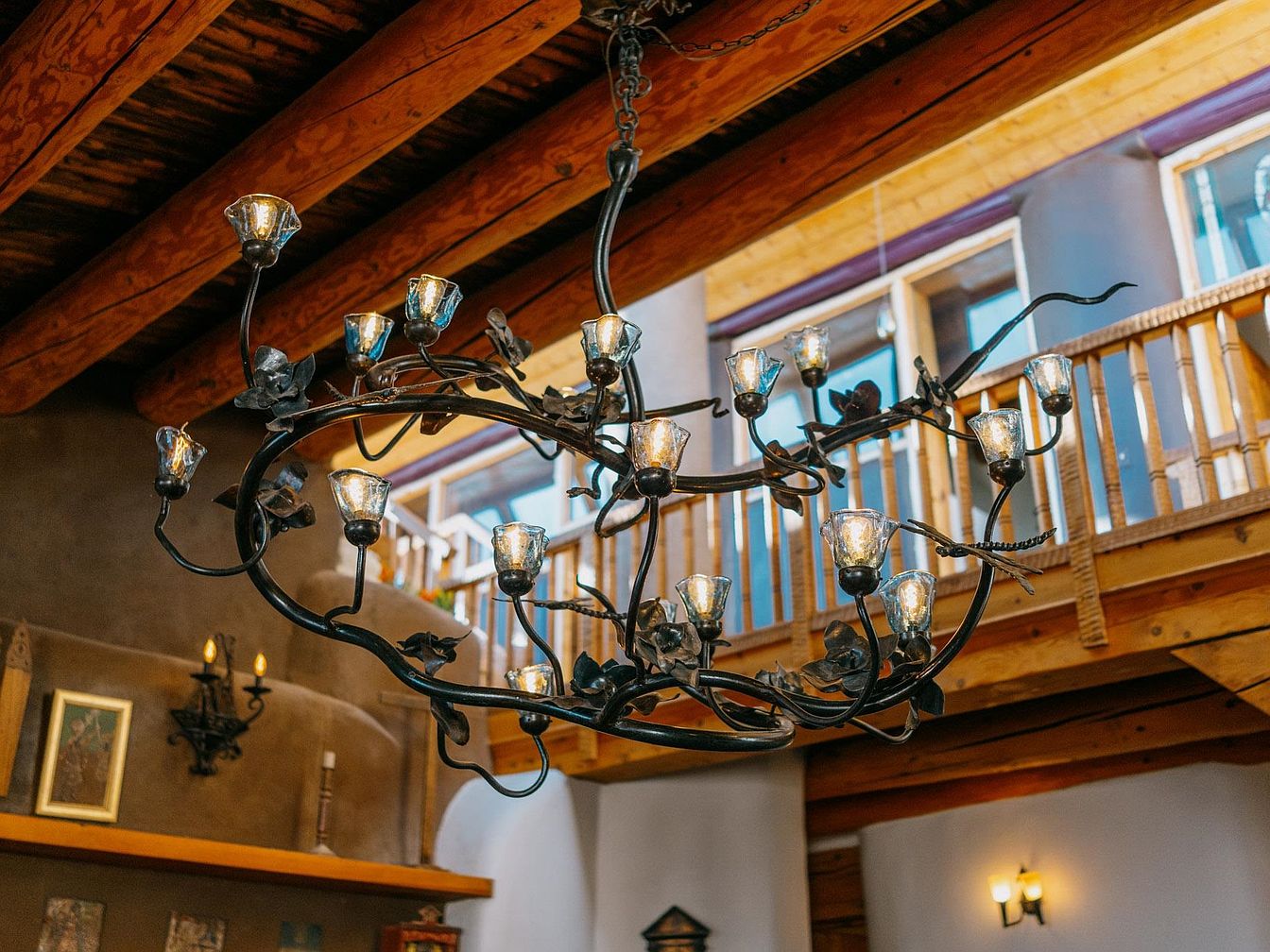 A stunning chandelier hangs gracefully from exposed wooden beams, casting a warm, inviting glow across the dining area. The artistic light fixture incorporates delicate floral designs, enhancing the room’s rustic charm. The walls are painted in soft earth tones, complementing the natural wood tones throughout. Textured surfaces create visual interest, while carefully curated artwork and sconces add character. An open layout seamlessly connects to the adjacent spaces, promoting family interaction. Large windows allow natural light to flood in, providing a cheerful ambiance. This space beautifully balances elegance with a cozy, welcoming atmosphere ideal for gatherings.