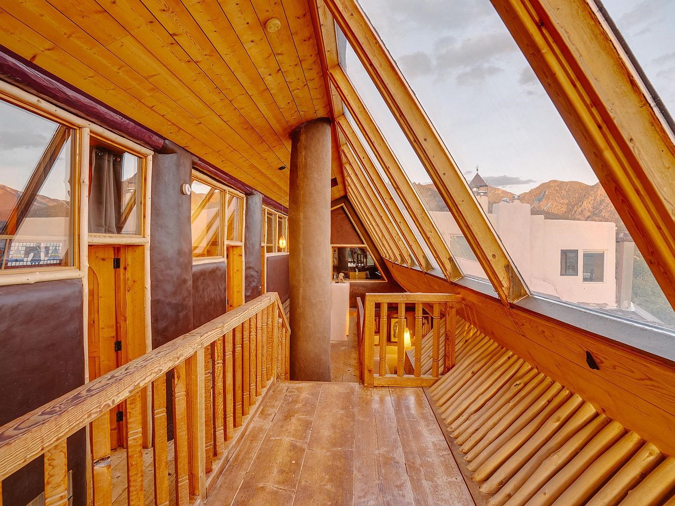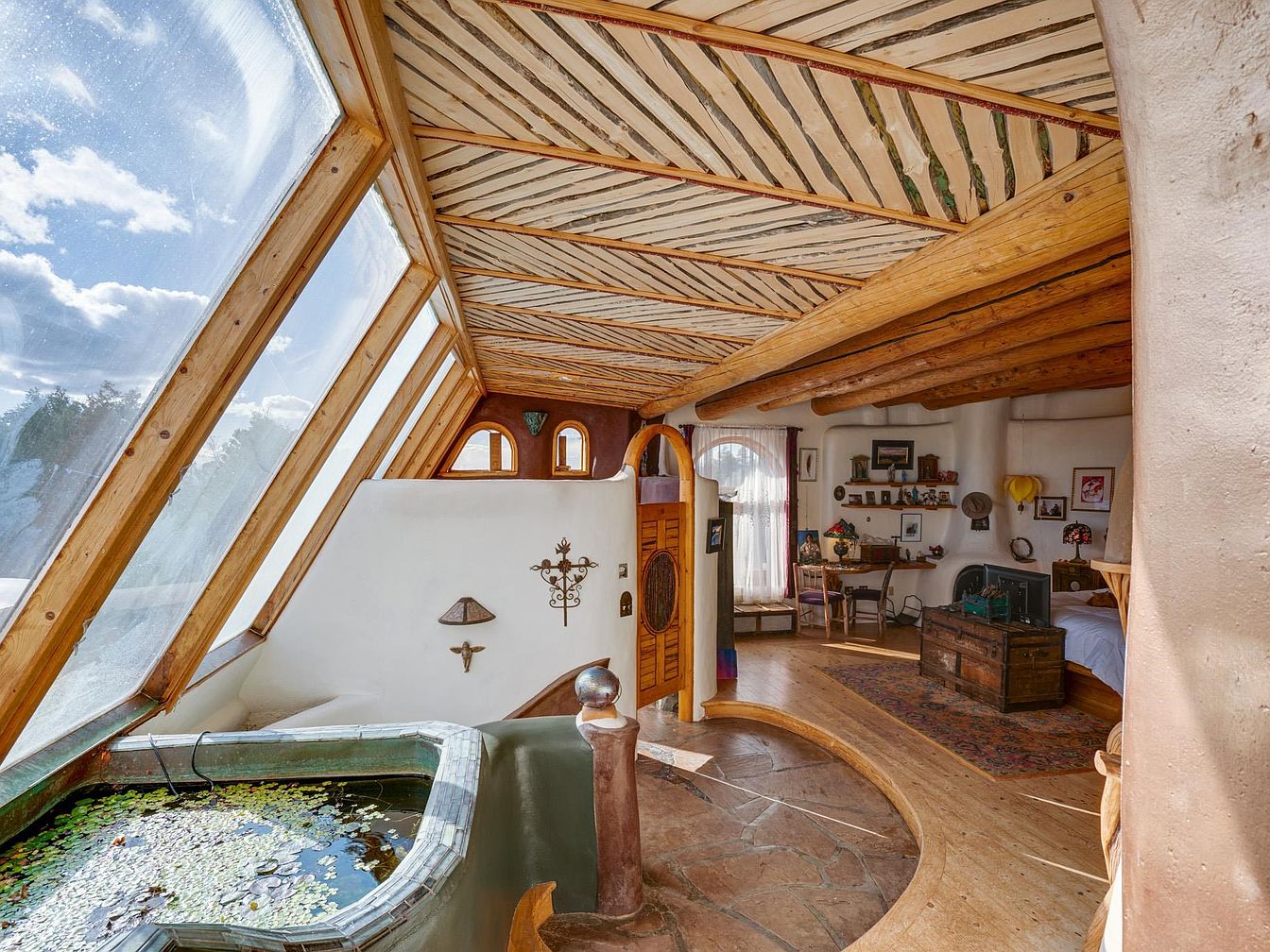 This inviting bedroom nook features a unique layout with sloping wooden ceilings and expansive windows that flood the space with natural light. The warm color palette, combining soft earth tones with rich wooden accents, creates a harmonious and cozy atmosphere. Thoughtfully placed furniture, including a vintage trunk and charming shelving, adds both functionality and character. Family-friendly elements, such as a comfortable bed and soft rugs, ensure an inviting space for relaxation. A tranquil indoor pond enhances the serenity, while decorative art pieces contribute to the home’s artistic flair, making it a perfect retreat for all ages.