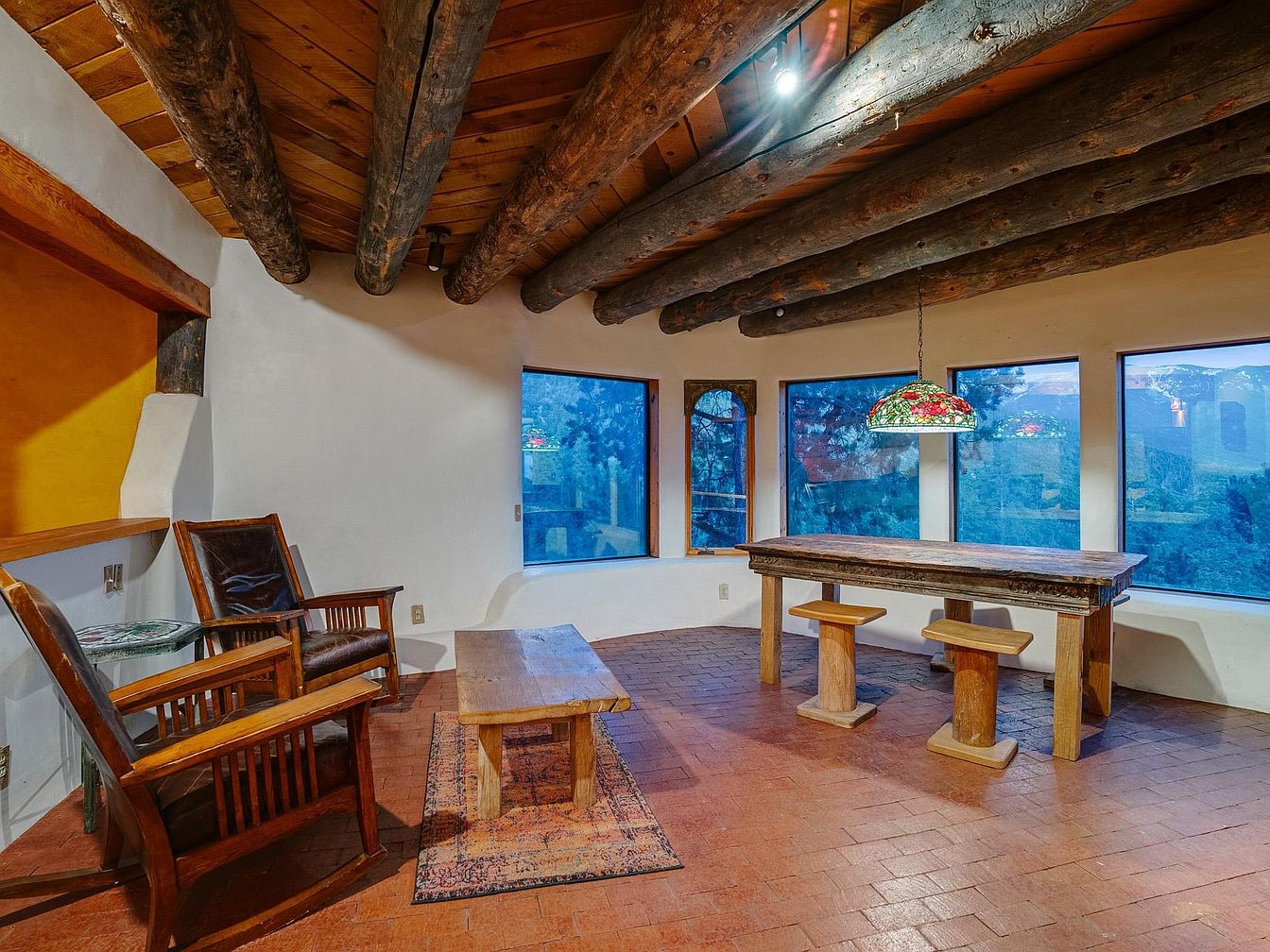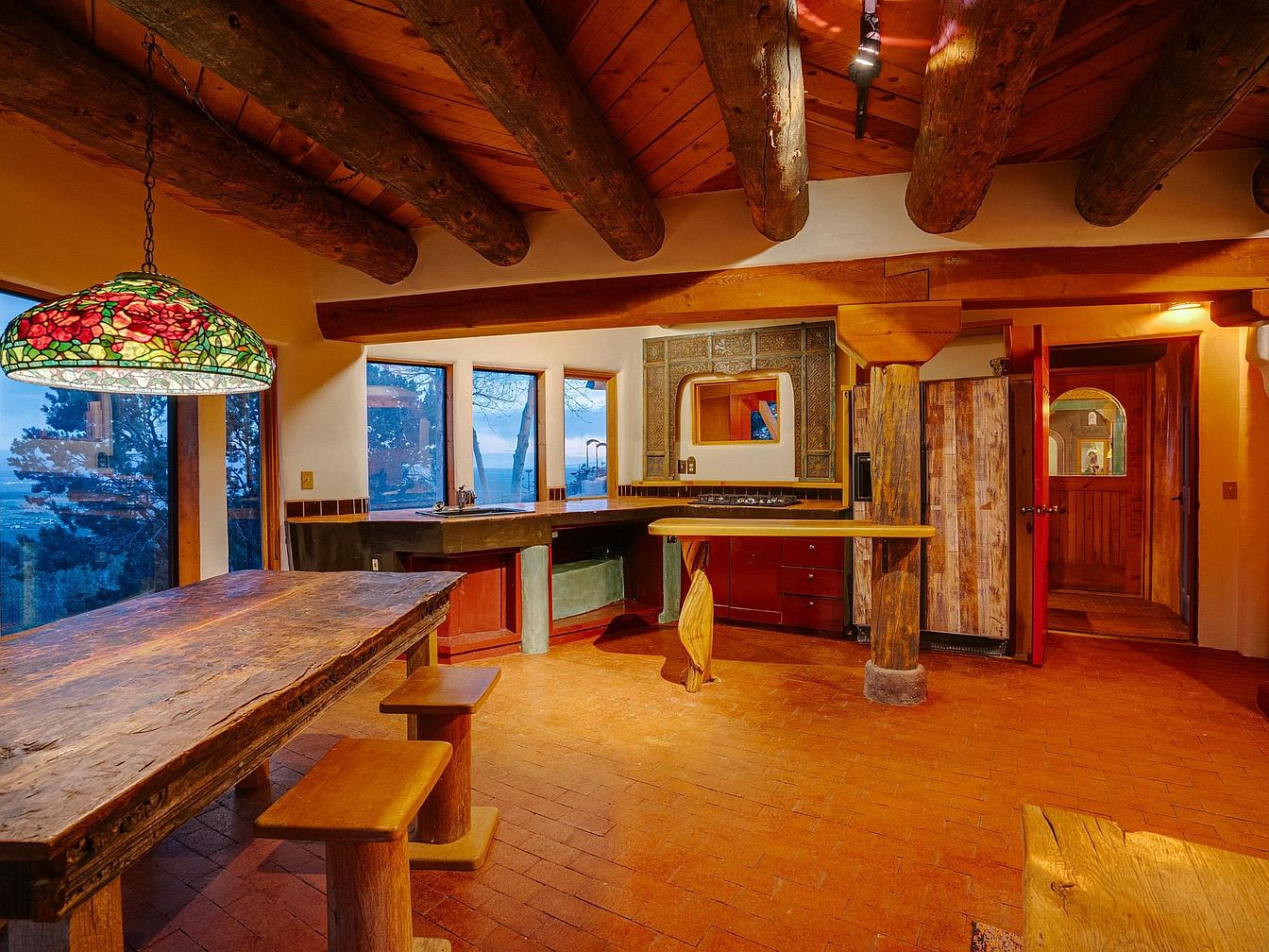 This charming dining area features an organic layout, with exposed wooden beams that enhance its rustic character. Light-colored adobe walls contrast beautifully with the warm terracotta tile flooring, giving the room a cozy yet spacious feel. Large windows invite abundant natural light and showcase stunning outdoor views, perfect for family gatherings. A striking stained glass pendant lamp hangs over a handcrafted wooden table, complemented by simple yet elegant stools. The warm wood tones of the seating and table create a harmonious environment, ideal for memorable meals and intimate conversations, making it a welcoming space for all.